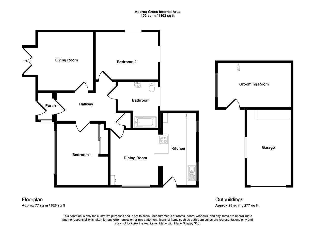 This spacious property has enjoyed the same ownership for the past 28 years and has accommodation in brief comprising; a large hallway, sitting room, kitchen/dining room, two double bedrooms and a well appointed family bathroom. Outside, the property offers well manicured enclosed gardens enjoying a southerly aspect, a garden shed, detached single garage and an adjoining room currently used at a dog grooming parlour with light and power.