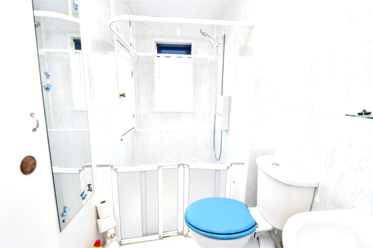 Fitted with a three piece suite currently adapted as a walk-in shower/wet room with electric shower, low level wc and pedestal wash hand basin, UPVC frosted double glazed window to the side, centre light, door to large airing cupboard and storage.