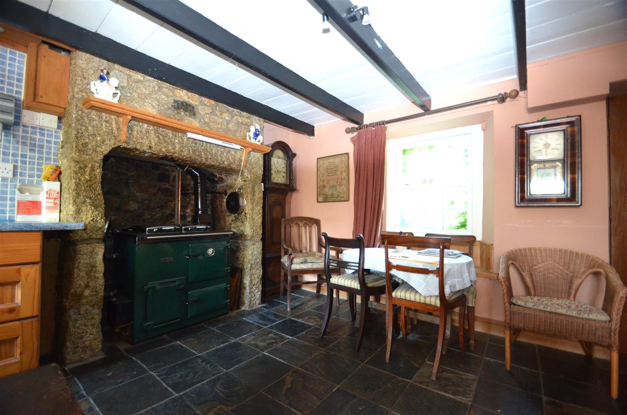 Granite fireplace housing an oil fired Rayburn oven with hot plates and central heating facilities, exposed beamed ceilings with spotlights, fuse box, under stairs storage area, tiled slate floor. From the kitchen a traditional door opens to a large conservatory.