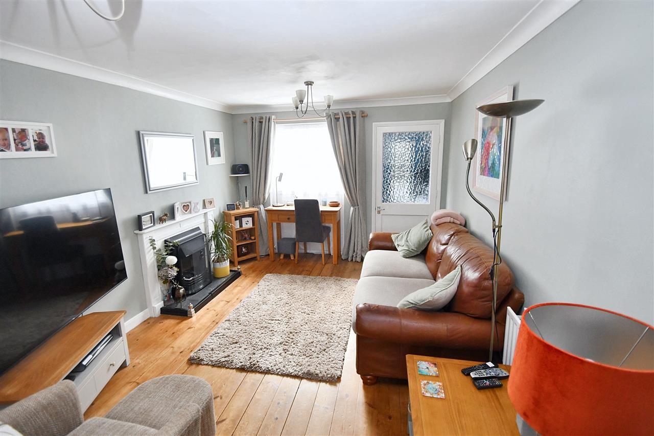 UPVC double glazed window to the front elevation, two pendant lights, feature fireplace with electric fire and painted wooden surround, thermostat control, radiator, useful under stairs storage cupboard, smoke detector, stripped wooden flooring, step up to multi-paned glazed door to: