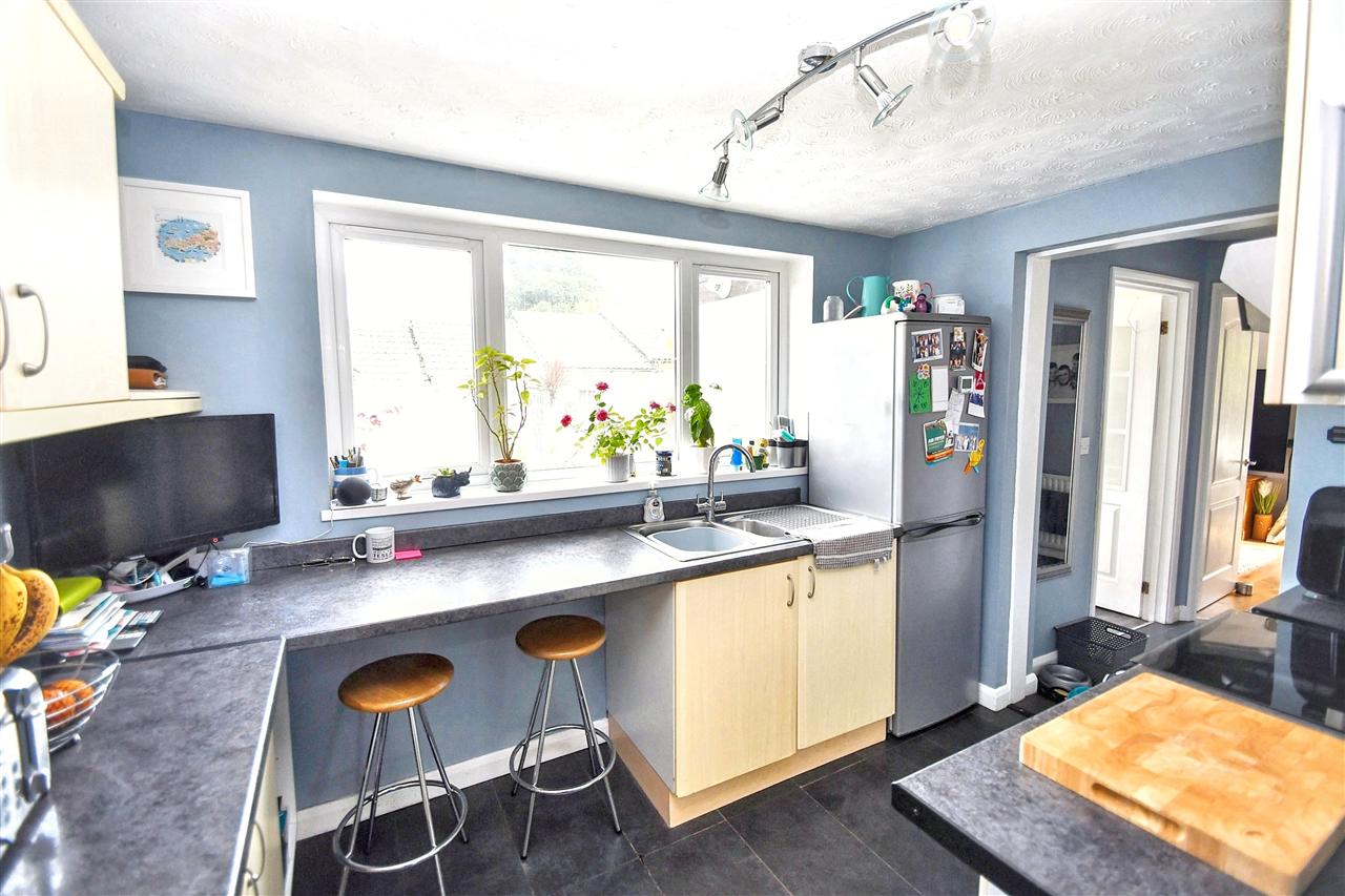 Fitted with a range of matching base and wall units in light wood effect with black roll top work surfaces with inset 1 1/2 bowl stainless steel sink unit with chrome mixer tap, space for freestanding cooker, space for refrigerator/freezer, under stairs storage cupboard, laminate flooring, spotlights on stainless steel bar, extractor fan, UPVC double glazed window overlooking the South East facing garden, opening leading to: inner hallway.