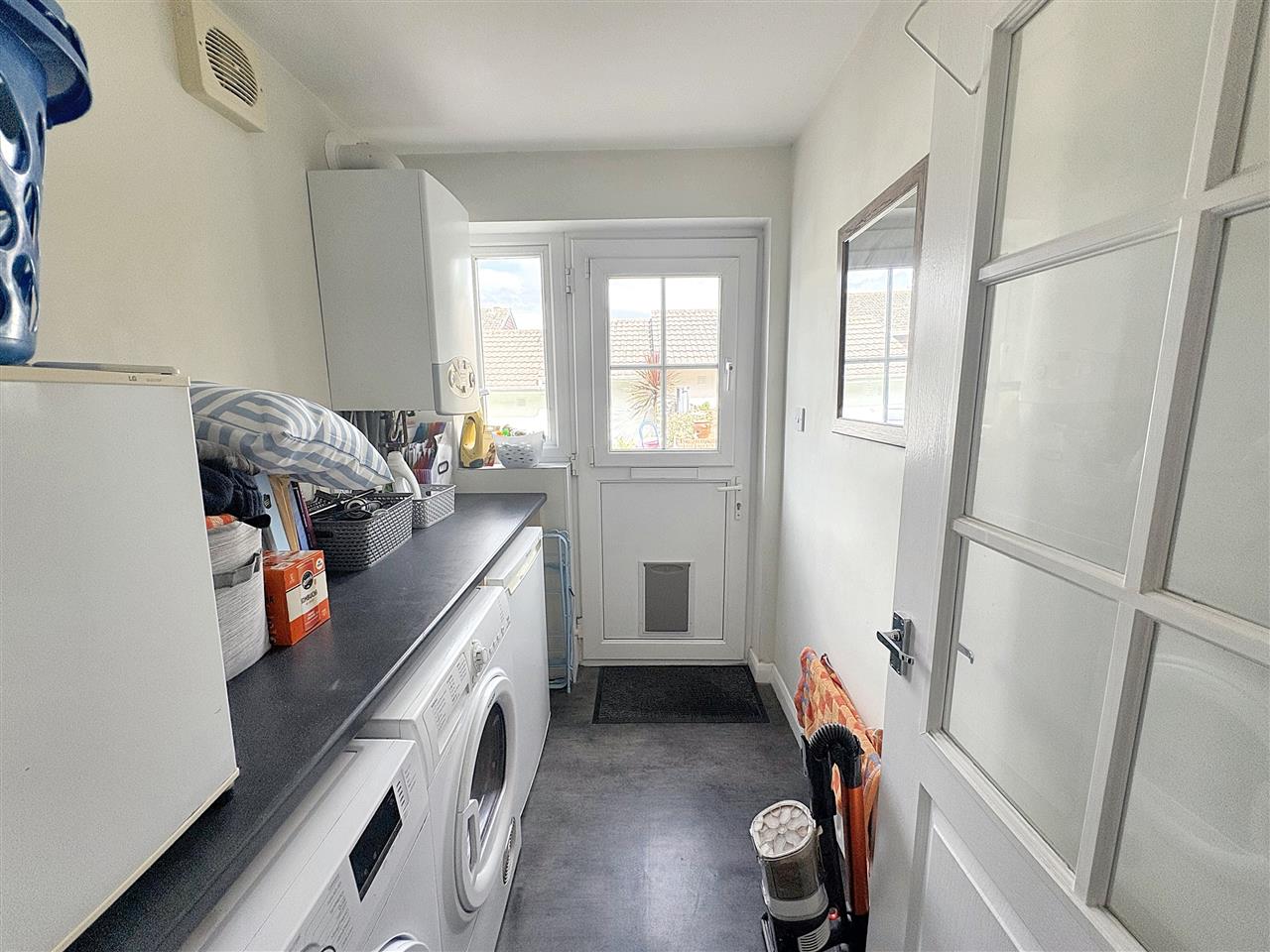 Access via a half glazed door from the inner hallway, half glazed UPVC door with cat flap and small window looking over and giving access to the rear garden, space for washing machine, tumble dryer and under counter refrigerator/freezer with black roll top work surface above, wall mounted boiler, vinyl flooring.