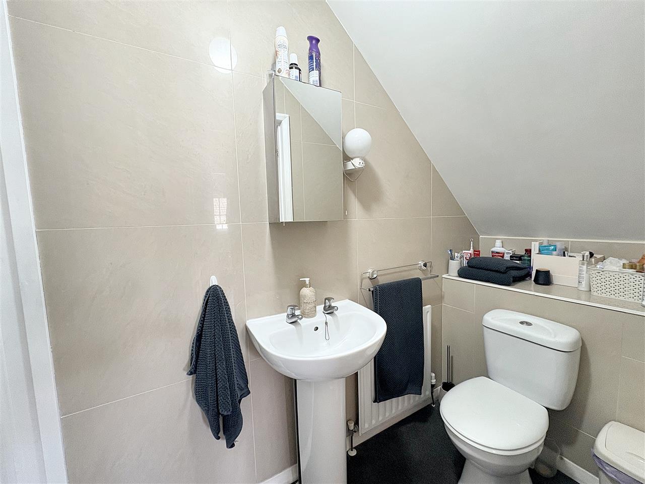 UPVC frosted double glazed window with Venetian blinds overlooking the side. Fitted with a white suite comprising; panelled enclosed bath with chrome mixer taps, low-level flush wc, pedestal wash hand basin with hot and cold taps and vanity mirror above, walk-in shower unit with glass screen, painted panelled walls to dado height.