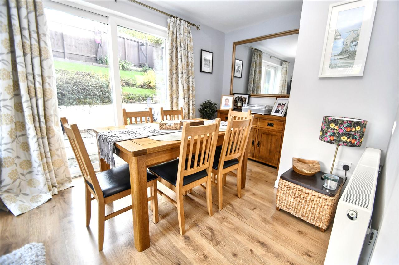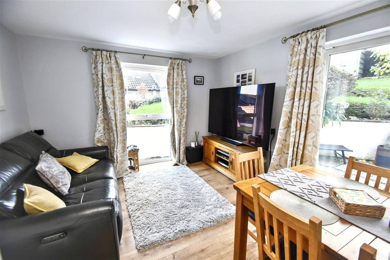 A dual aspect room with UPVC double glazed window and UPVC double glazed sliding patio doors leading the side elevation, central pendant light, radiator, laminate flooring.