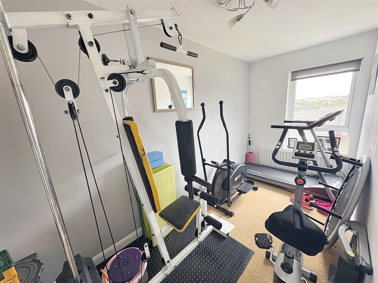 Currently used as a gym. UPVC double glazed window overlooking the rear garden, central pendant light, radiator, fitted carpet.