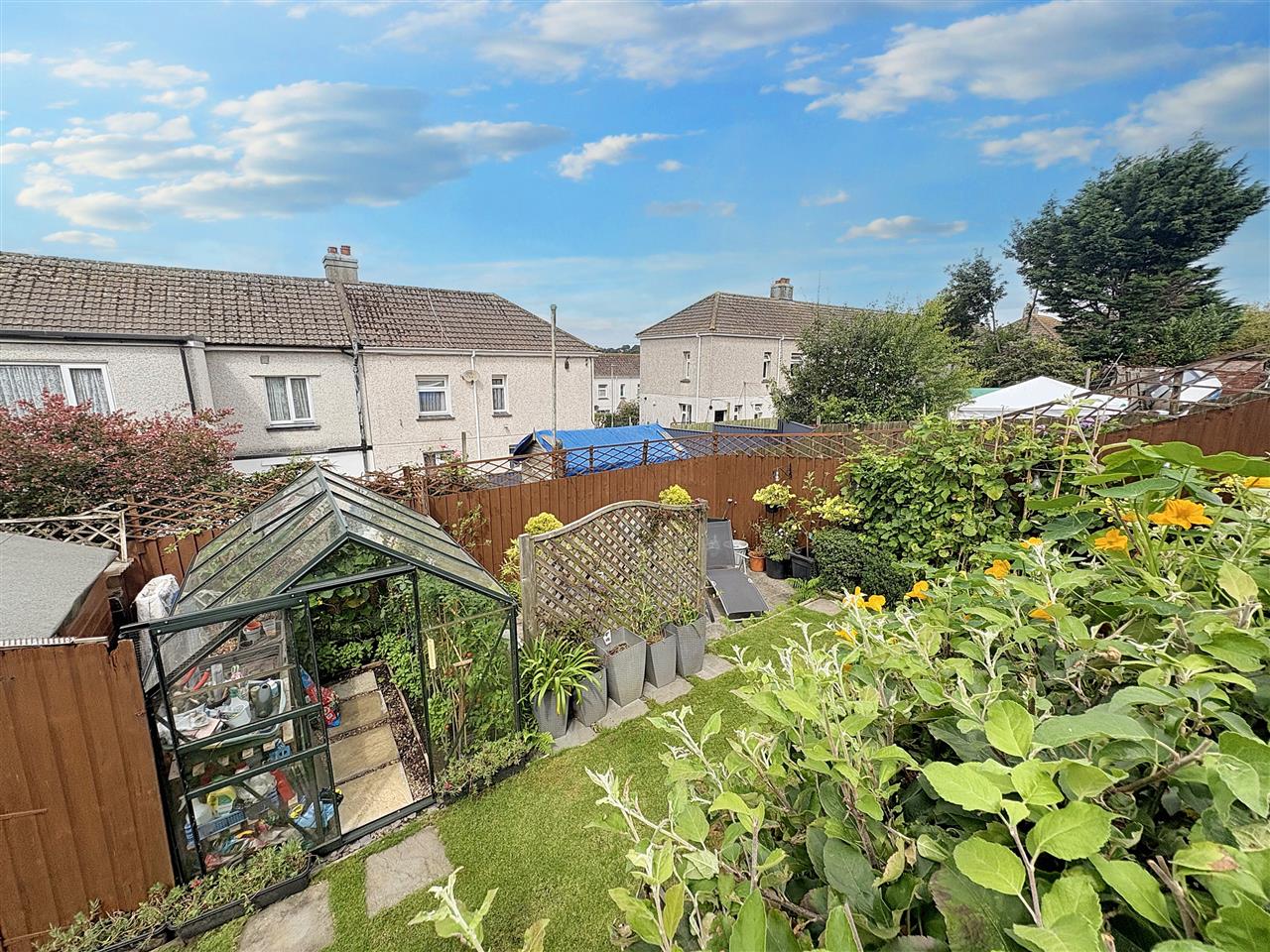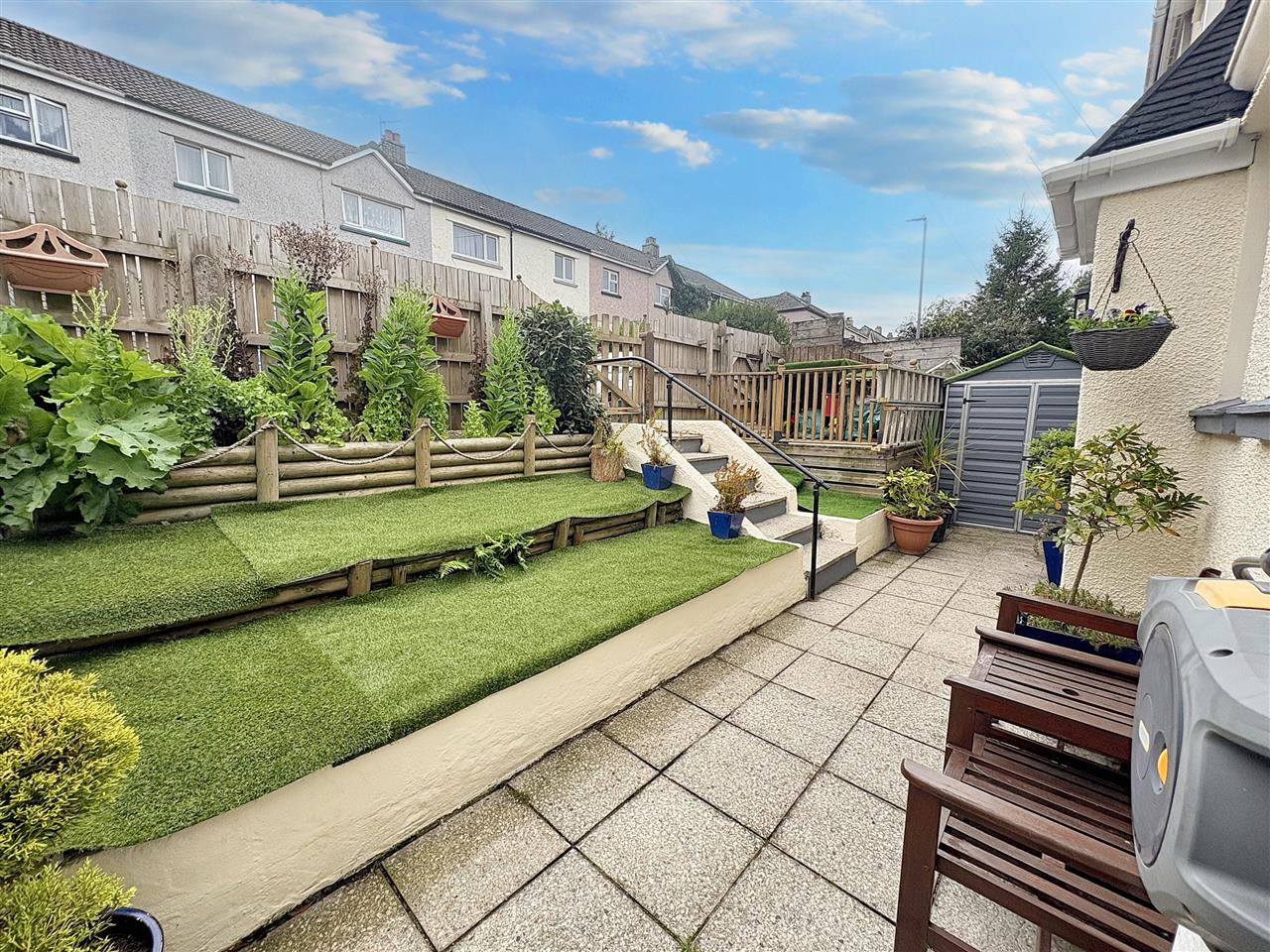 Accessed via steps from the kitchen and lounge and from the utility area. This superb enclosed garden enjoys a good degree of privacy with a wide paved patio that spans the width of the property plus a timber decked area that has space for a patio table and chairs, cold water supply and paved steps either side leading down to a lawned terrace that has a timber garden shed, greenhouse and a decked area with rotary clothes dryer. From here steps lead down to a further terrace having a paved patio area enclosed by closed board fencing. The garden as a whole is enclosed and provide a good degree of privacy,