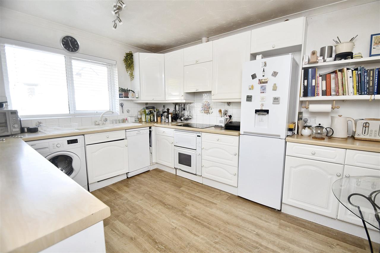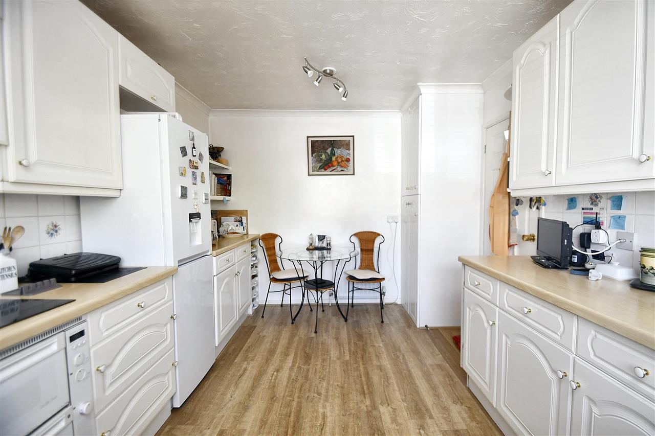 Another bright room which faces the front aspect and enjoys a pleasant outlook through double glazed windows across the front garden, venetian blinds. Well equipped with a range of matching wall and base units in high gloss white, wrap around roll top work surfaces, ceramic tiling and over counter lighting, double drainer composite 1 1/2 bowl sink unit with mixer taps and tiled splash back, electric induction hob with cooker hood over and double oven under, space for tallboy fridge/freezer, washing machine, plumbing for dishwasher, coved cornicing, two sets of spotlights on tracking, double radiator, broom cupboard, hard wearing wood finish flooring, panelled internal door returning to the hallway.