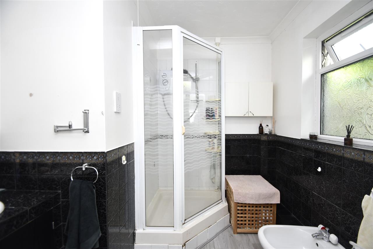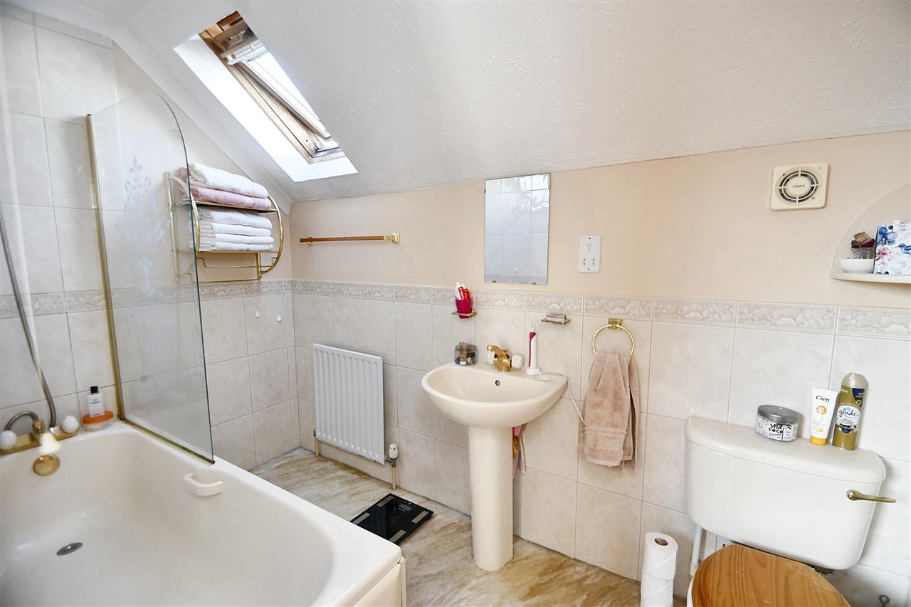Having a coloured suite comprising handled and panelled bath, mixer tap, shower attachment, fully tiled surround and screening, pedestal wash basin with tiled splash back and mixer tap, fitted mirror, shaver point, low flush wc, radiator, half tiled walls, Velux double glazed window, spotlights, bathroom cabinet, panelled internal door.