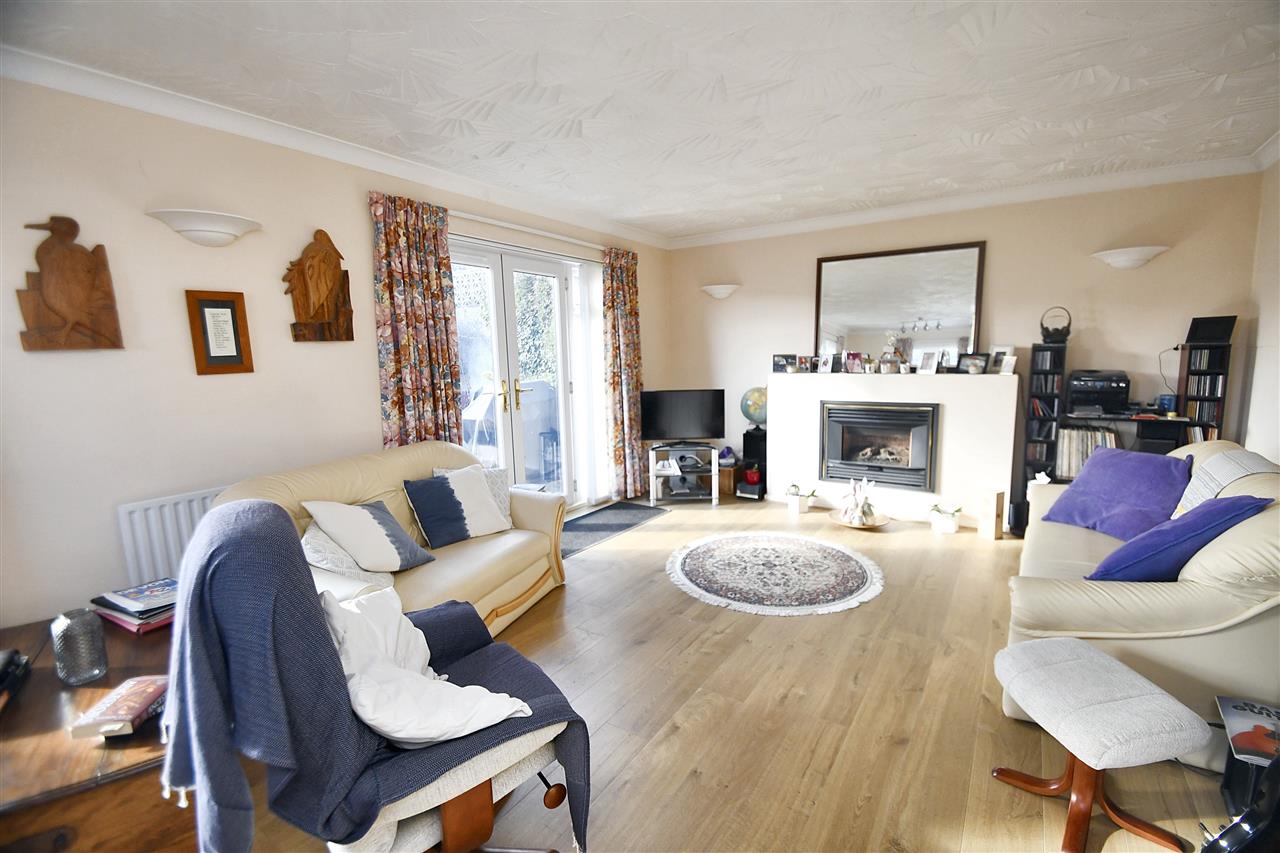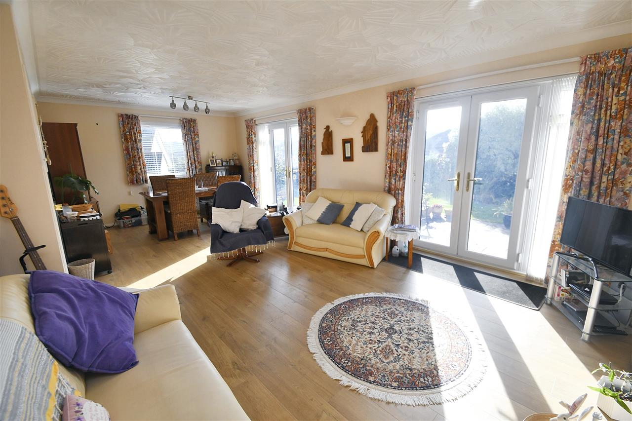 A delightful open reception room which has a light dual aspect with two sets of replacement UPVC double glazed French doors with matching wide panels and vertical blinds leading to and overlooking the garden and matching double glazed window overlooking the side, venetian blinds, focal point fireplace with Valor gas fire, three radiators, coved cornicing, three uplighters on dimmer switches, TV aerial point, over dining table spotlights, hard wearing wood finish flooring.