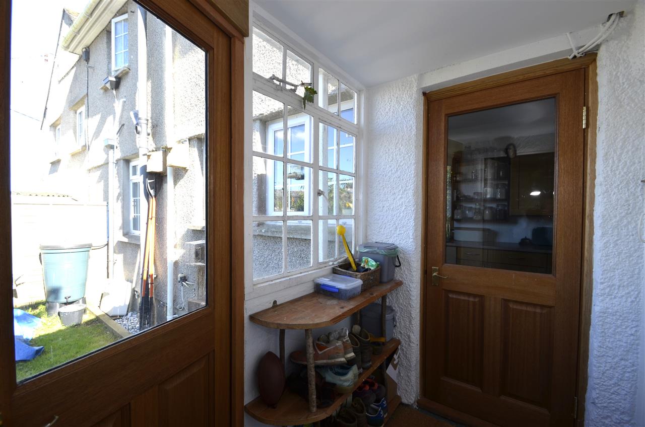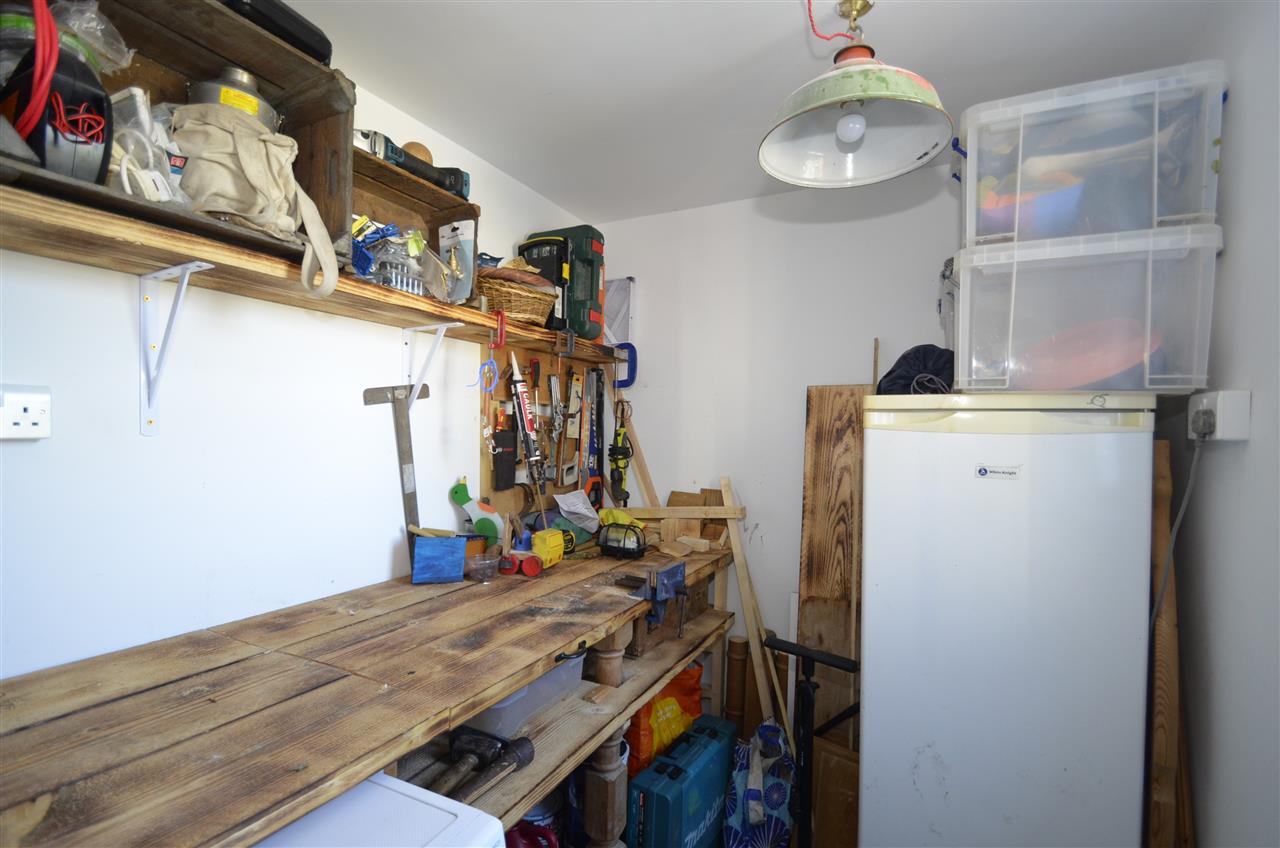 A small paned window with outlook over the garden, shelving for shoes, plastered ceiling, recently fully insulated with a new roof, doors to storage area, wc and to the workshop, new solid oak door with brass furniture opening to the side and the enclose garden.