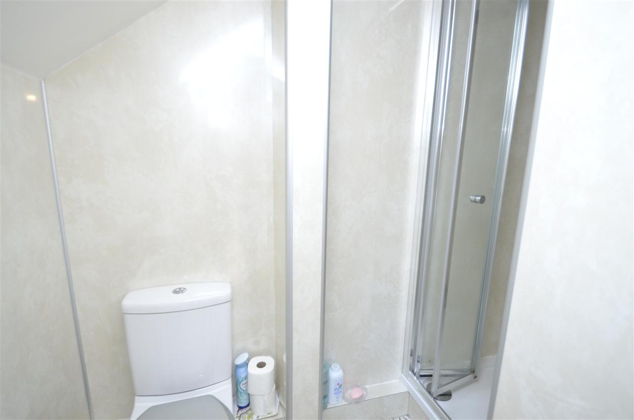 A modern en-suite with a shower cubicle with bi fold doors, a mixer shower with elevated shower rose, low level wc with push button flush and a wall mounted sink. Panelled wipe clean walls, extractor fan and ceiling light.