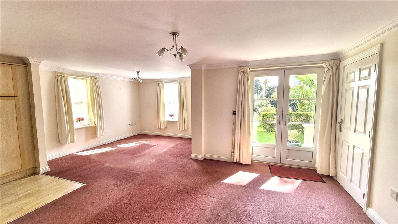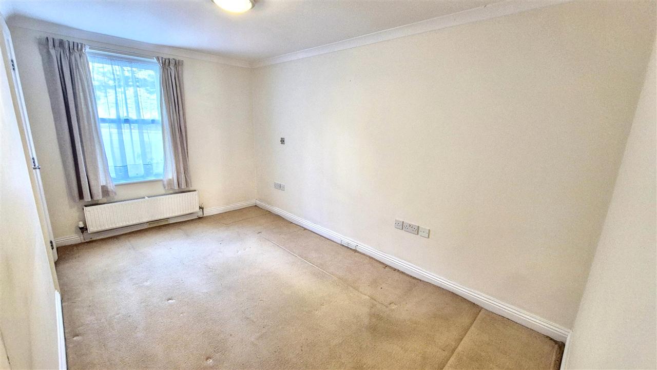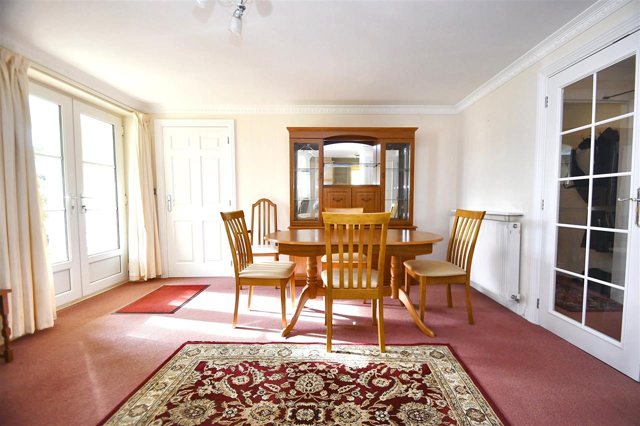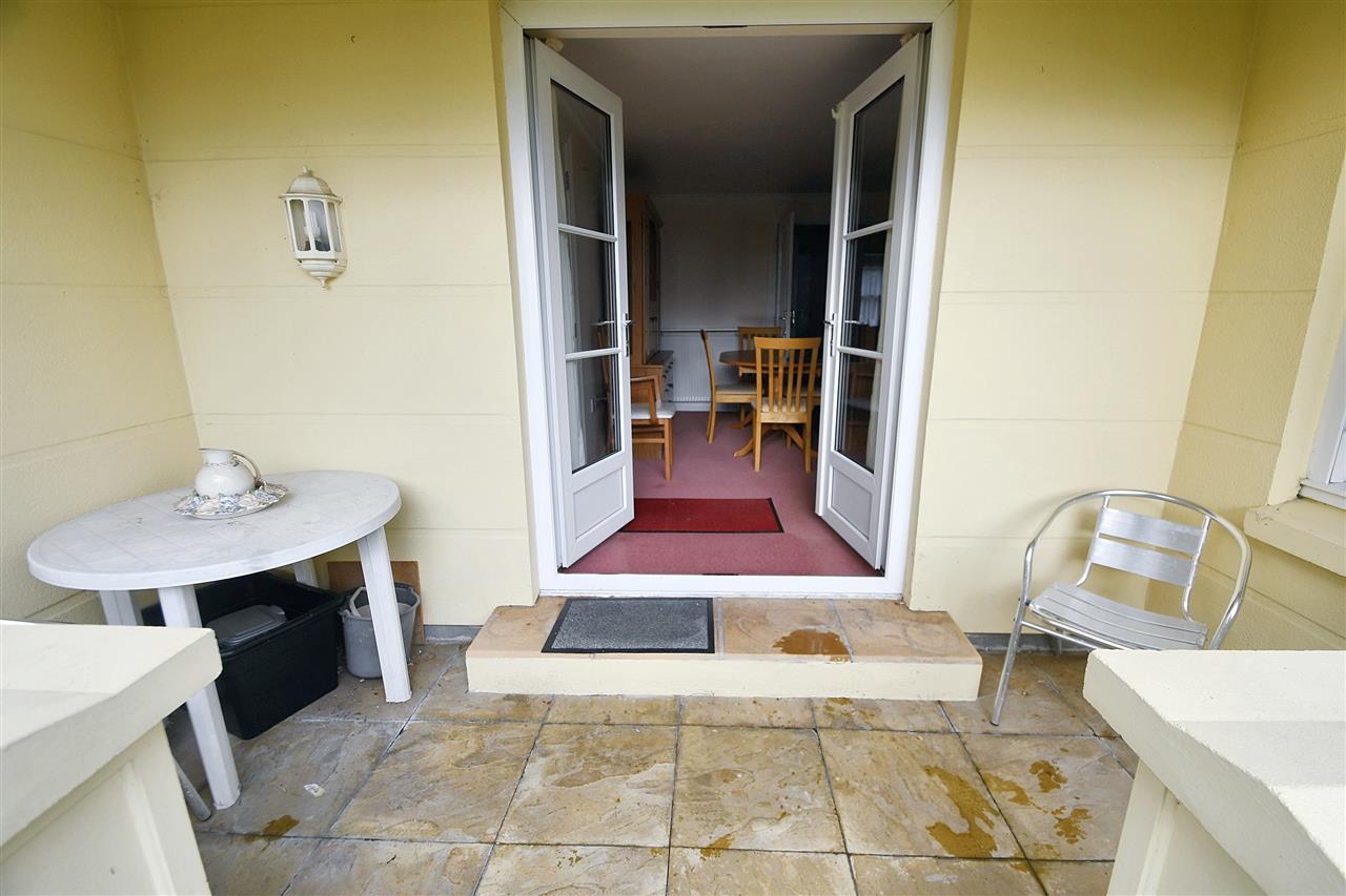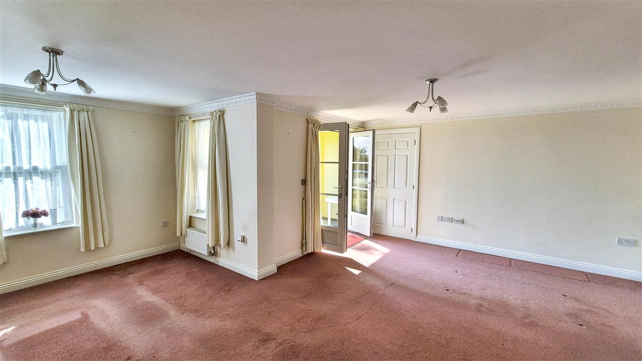With ornate coved cornicing, spacious full height storage cupboard with shelving, stainless steel ceiling light, fitted carpet, TV aerial point, double radiator with shelf, UPVC multi-paned French doors leading to the patio and communal garden.