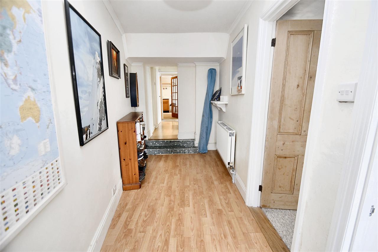 A spacious hallway with laminate wooden effect flooring, pendant light fitting, coat hooks, smoke detector, radiator, feature tiled steps lead up to a further hall that provides access to three sizeable storage cupboards whereby you will find the electric fuse box and Ideal gas combination boiler (serviced October 2025) respectively. Doors to: