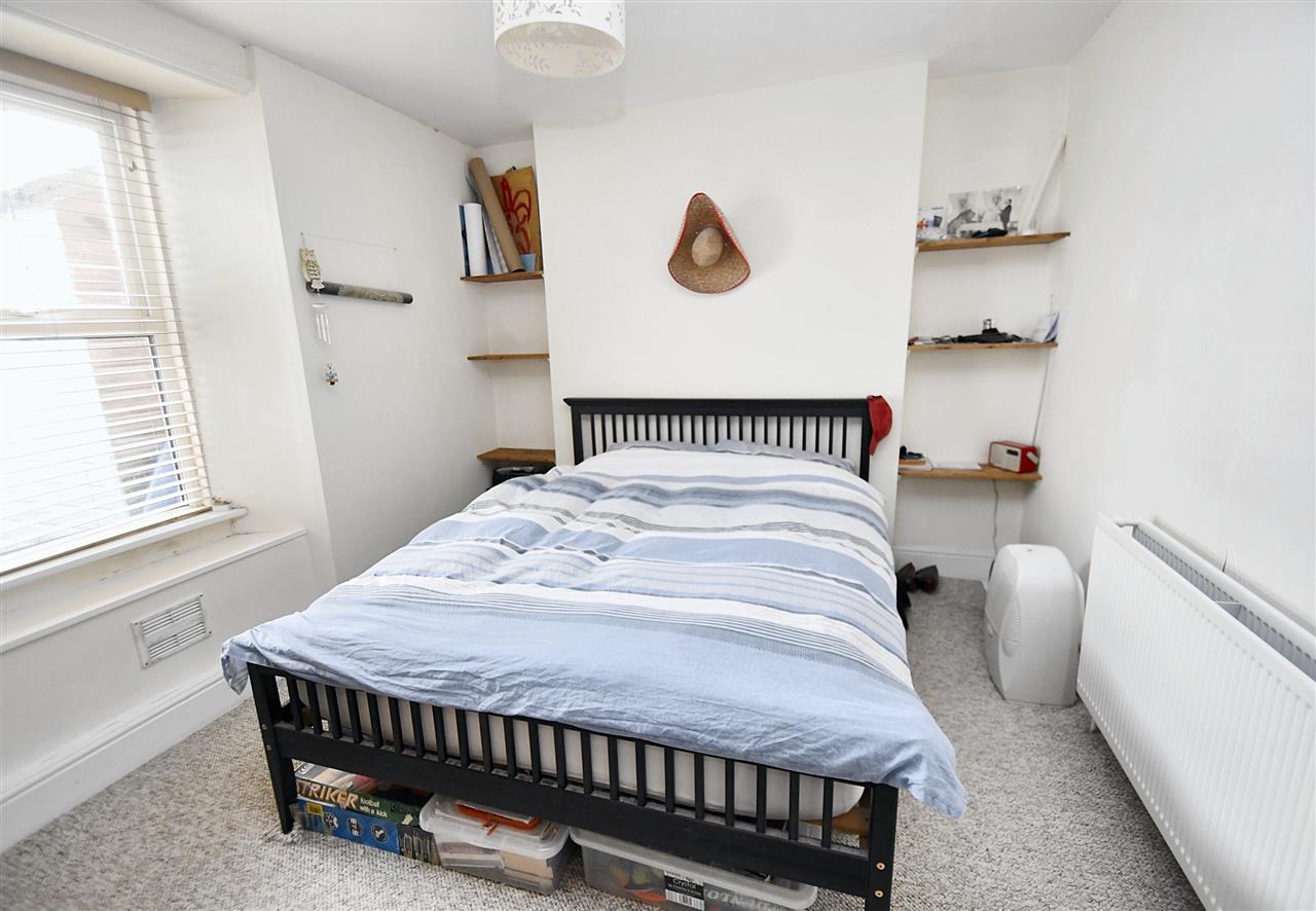 UPVC double glazed window overlooking the rear courtyard garden, wooden panelled door, pendant light fitting, two recessed alcoves with wooden shelving, carpeted, radiator.