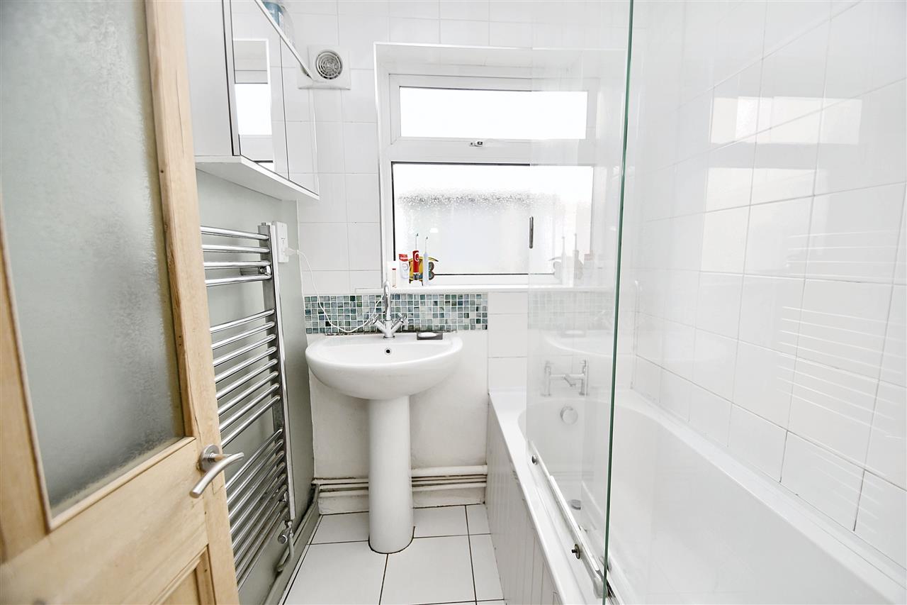 UPVC double glazed obscured window, white suite comprising of pedestal wash hand basin with chrome mixer tap, panelled enclosed bath, part tiled walls with electric Mira shower over, riser rail with shower head attachment, glass screen, tiled flooring, four recessed spotlights, chrome ladder style towel rail, wall mounted glass fronted cabinet, Enviro Vent extractor fan, half glazed wooden door.
