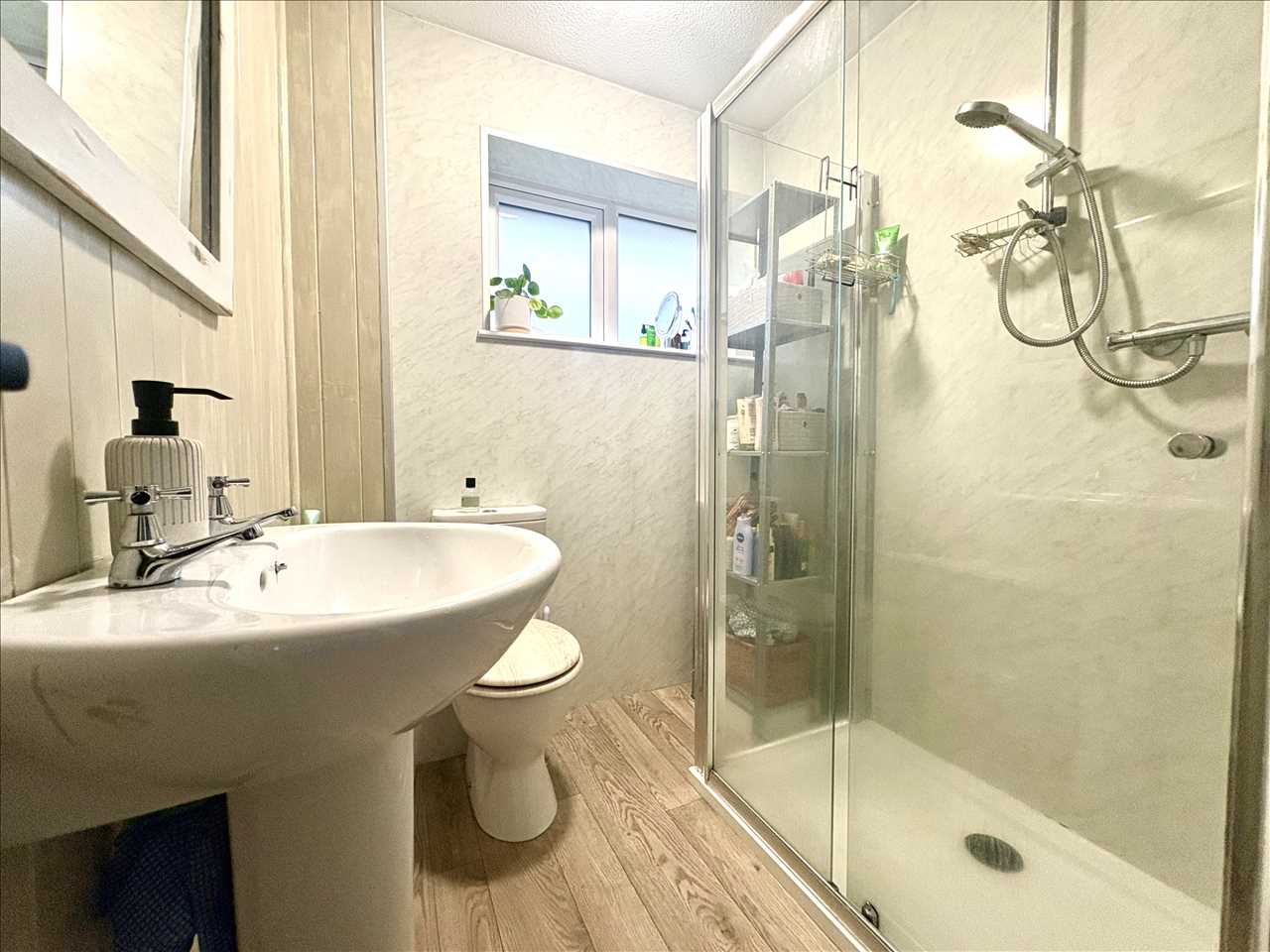 Fitted with a contemporary white suite comprising of a low flush wc, pedestal hand wash basin and walk in shower cubicle with mains power shower and sliding glass screen. Obscured glass window to the rear elevation, towel rail/radiator.