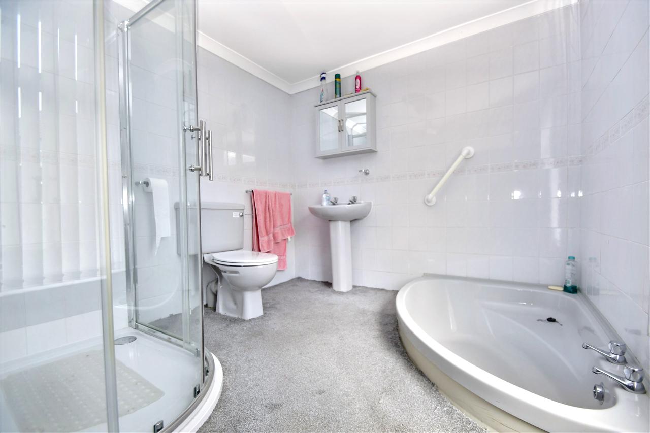 UPVC double glazed window to rear aspect, a well appointed bathroom comprising a four piece suite including a sunken corner bath with moulded seat, separate double shower cubicle with electric shower and glass curved screen, low level wc, pedestal wash hand basin, wall mounted cabinet, fully tiled, coved ceiling, central ceiling light and finished with a carpeted floor.