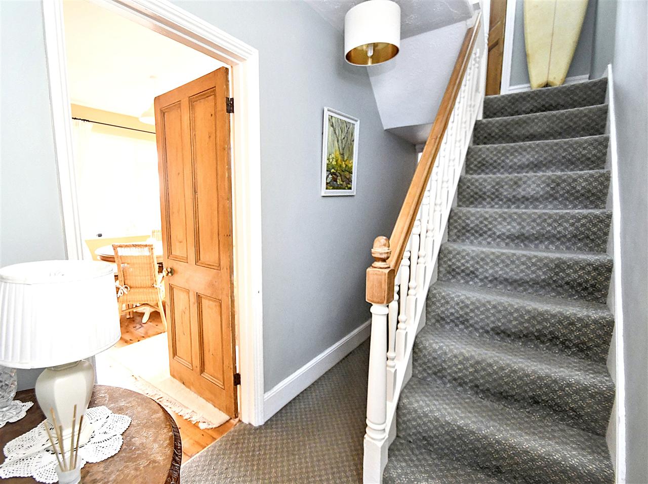 The accommodation includes on the ground floor, an entrance vestibule, reception hall, sitting room, separate dual aspect dining room, fitted galley style kitchen with Rayburn range and a utility with cloakroom at the far end. A turning staircase leads to the mezzanine level where you can find a large family bath/shower room, a turning staircase continues to the first floor landing which has three bedrooms (one with views down to the creek between houses).