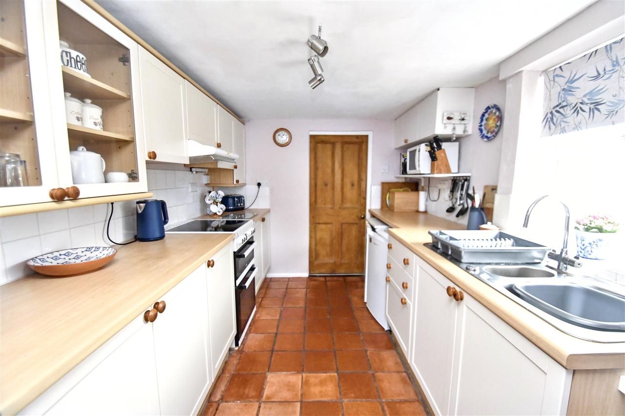 A long galley style kitchen equipped with a range of matching wall and base units, wood effect roll top work surfaces and ceramic tiling over, 1 1/2 bowl stainless steel sink unit with chrome swan neck mixer tap, electric cooker panel and cooker hood over, space for under counter refrigerator and freezer alongside, radiator, double glazed window overlooking the side patio area with views to countryside, fitted shelf for microwave, spotlights on tracking, solid fuel Rayburn range set in a tiled recess (for cooking and heating), terracotta tiled flooring, pine latch and brace door to: