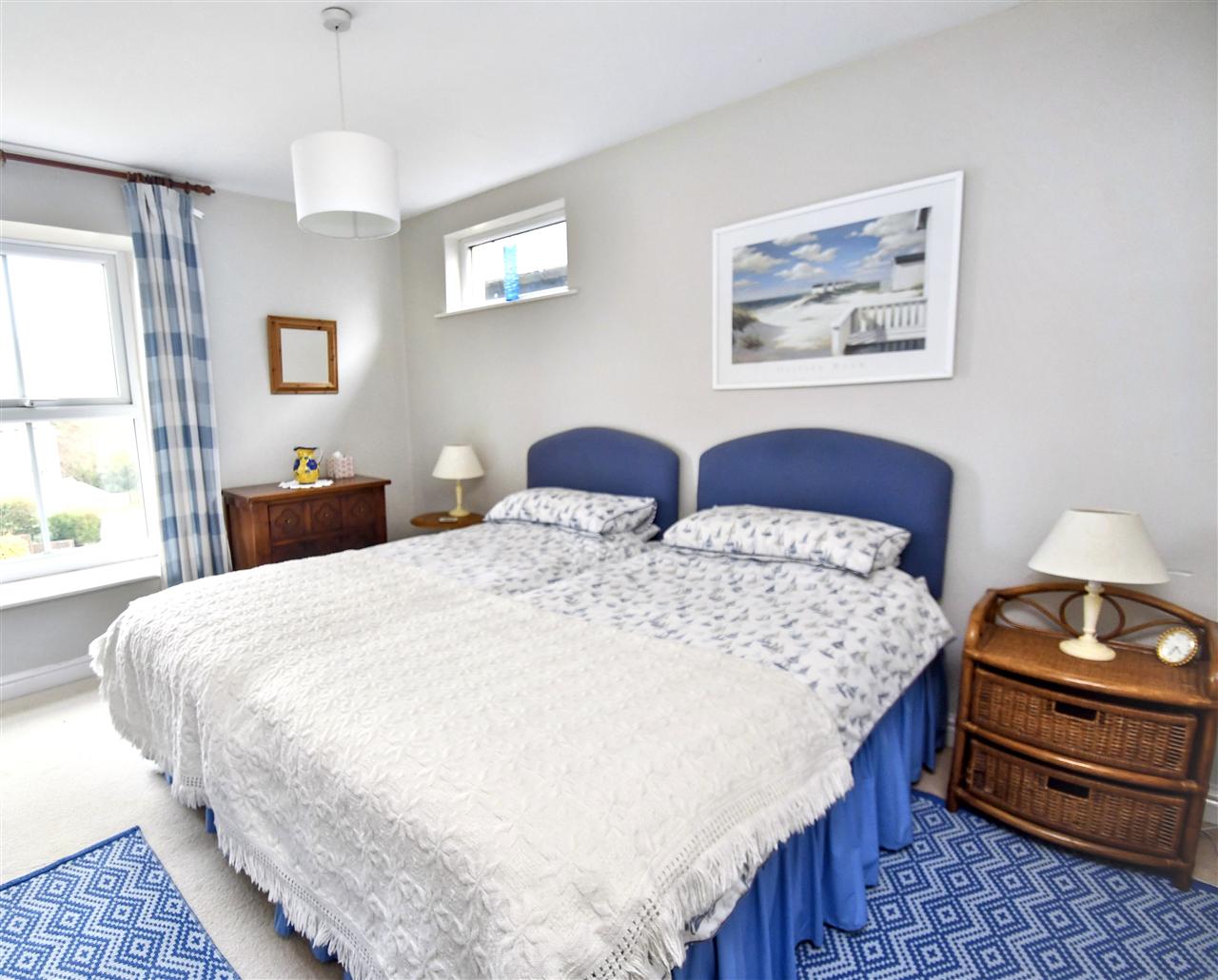 A deep recessed box sash style double glazed window enjoying a pleasant outlook towards the village, fitted carpet, radiator, stripped pine internal door.