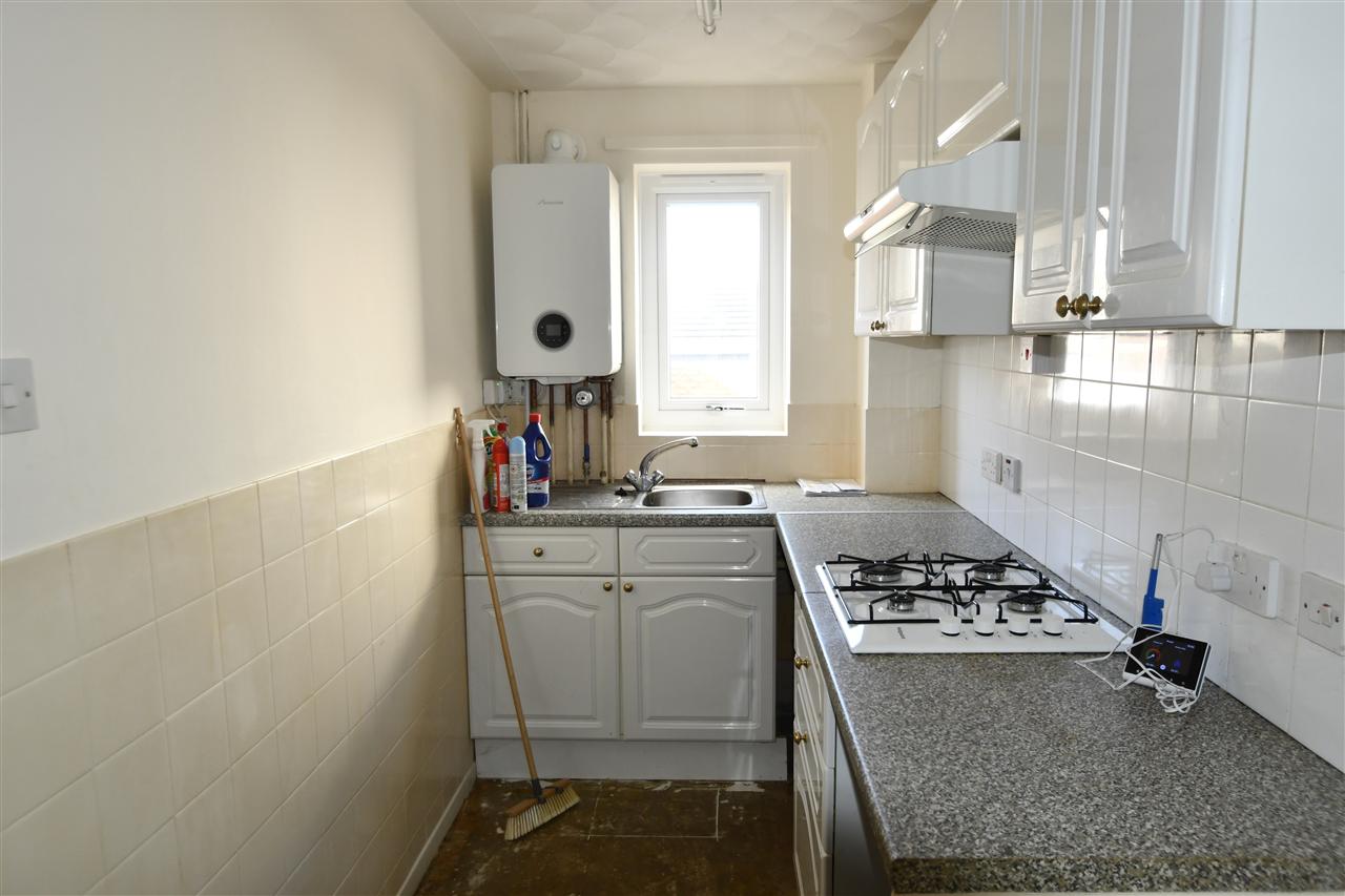 UPVC double glazed window to the side elevation. Fitted with a range of white fronted wall and base units with marble effect roll top work surfaces and ceramic tiling over, inset stainless steel sink unit with chrome mixer tap, inset Hotpoint four-ring gas hob with Hygena extractor fan over, space and plumbing for automatic washing machine, space for under counter refrigerator, Worcester gas central heating boiler, textured ceiling, small strip light, radiator.