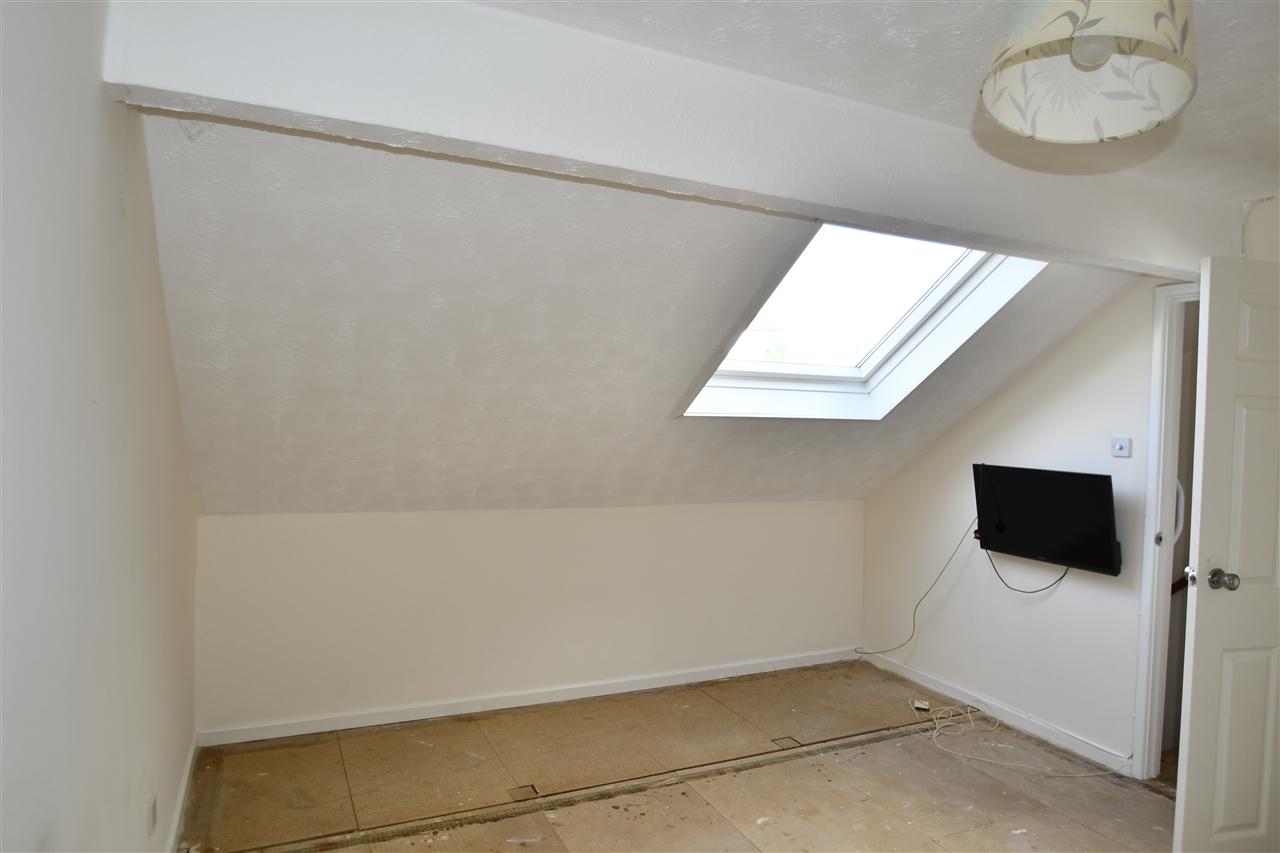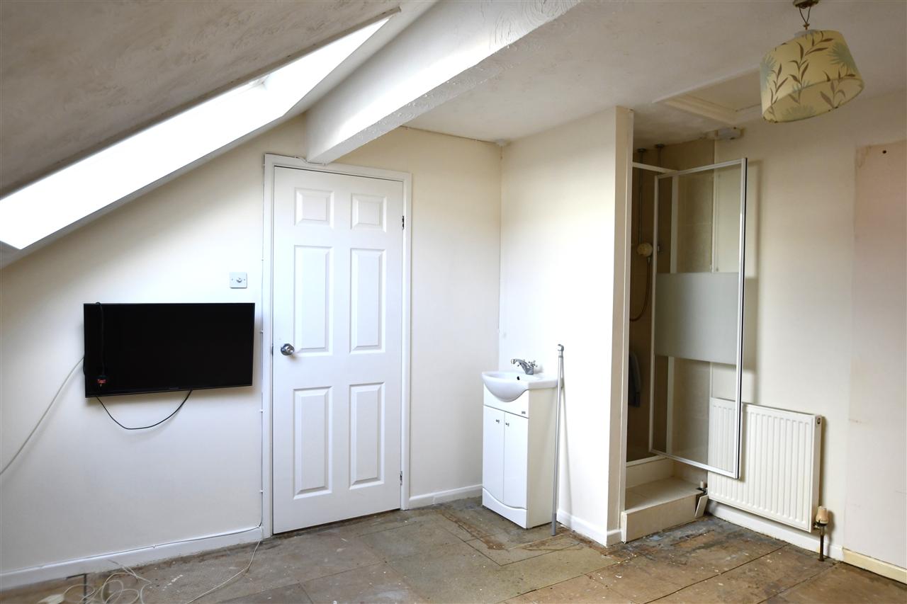 Textured ceiling, large Velux window to the front, ceiling light with dimmer switch, access to loft space, radiator, shower cubicle with glass screen being fully tiled and with mains fed rise and fall shower head, small china wash hand basin with chrome mixer tap set on a white gloss vanity unit with cupboard below.