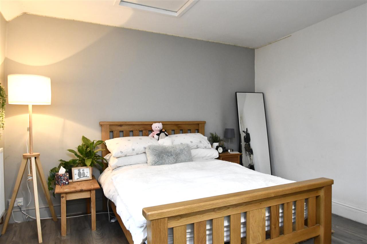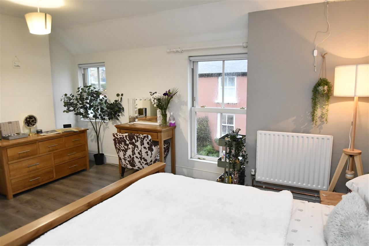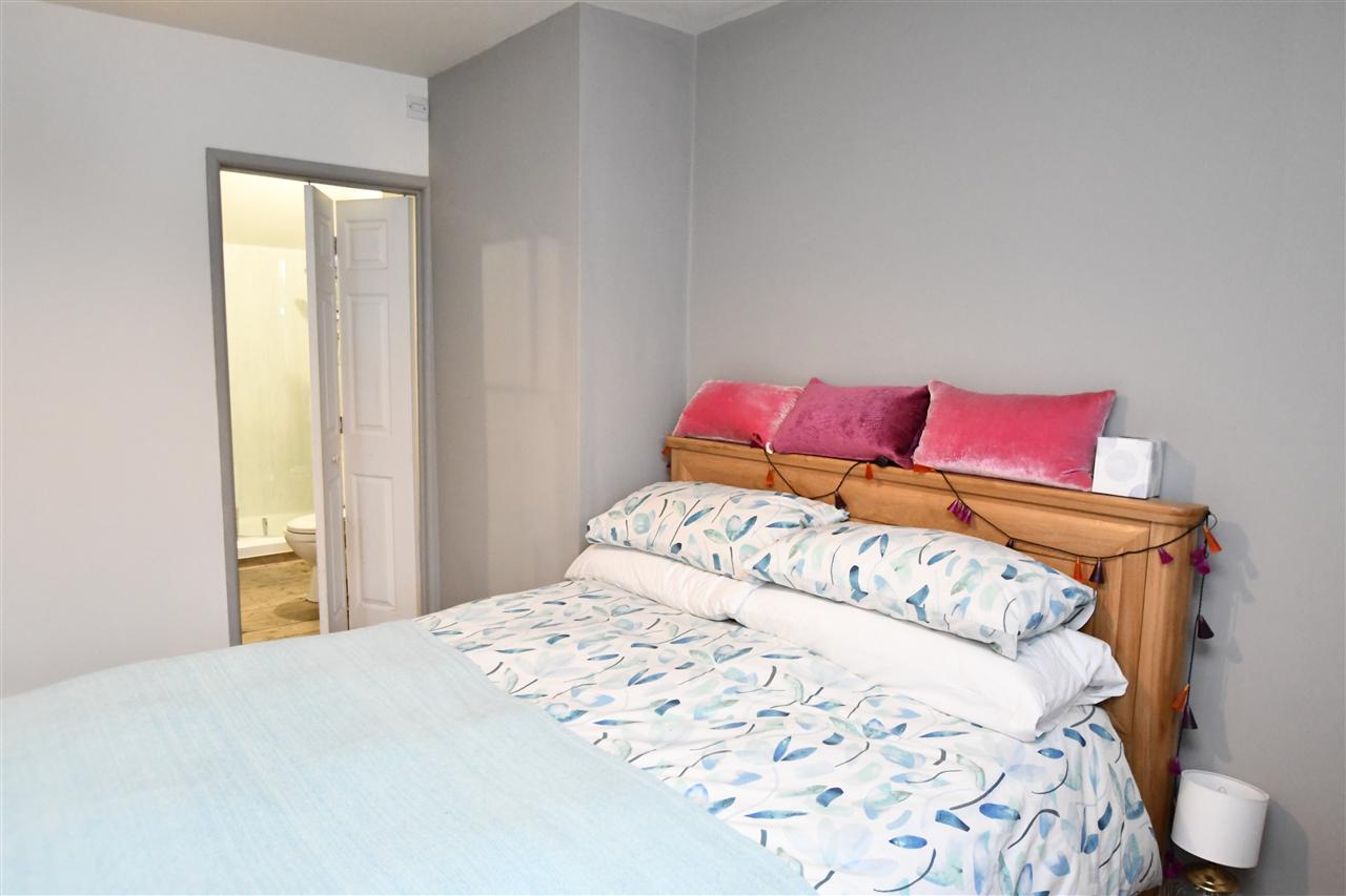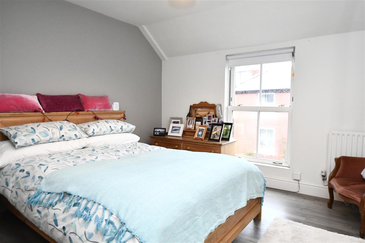 A spacious L-shaped bedroom with two recessed UPVC double glazed sash windows overlooking the front aspect, hard wearing wood finish flooring, radiator, access to insulated loft space, built-in storage cupboard, panelled internal door.