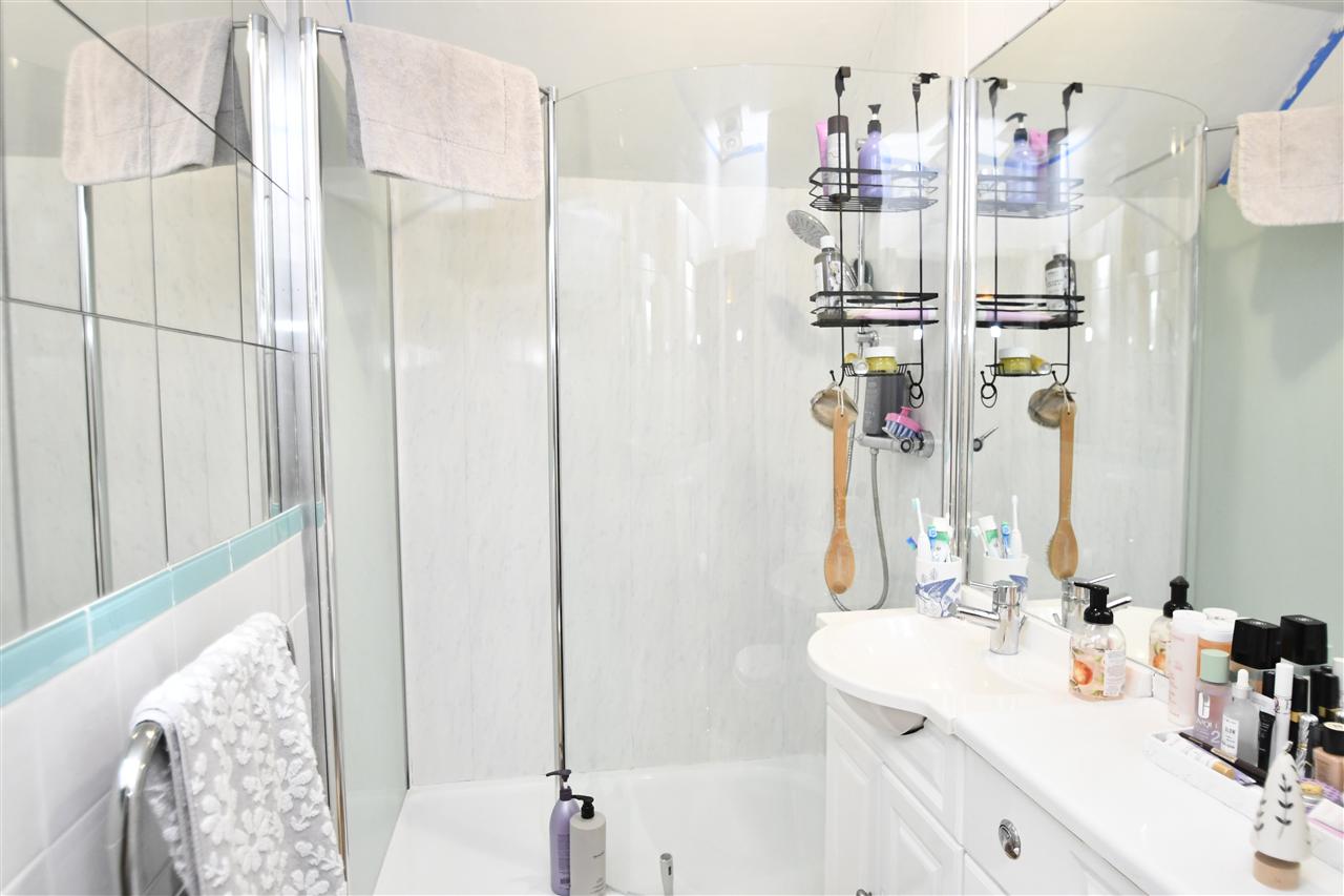 Well appointed with a white suite comprising; large double shower area, chrome mixer shower and glass screening, wash hand basin set in a vanity unit, low flush wc, large mirror and accessory cupboard alongside, extractor fan, further ceramic and mirrored tiling, heated towel rail.