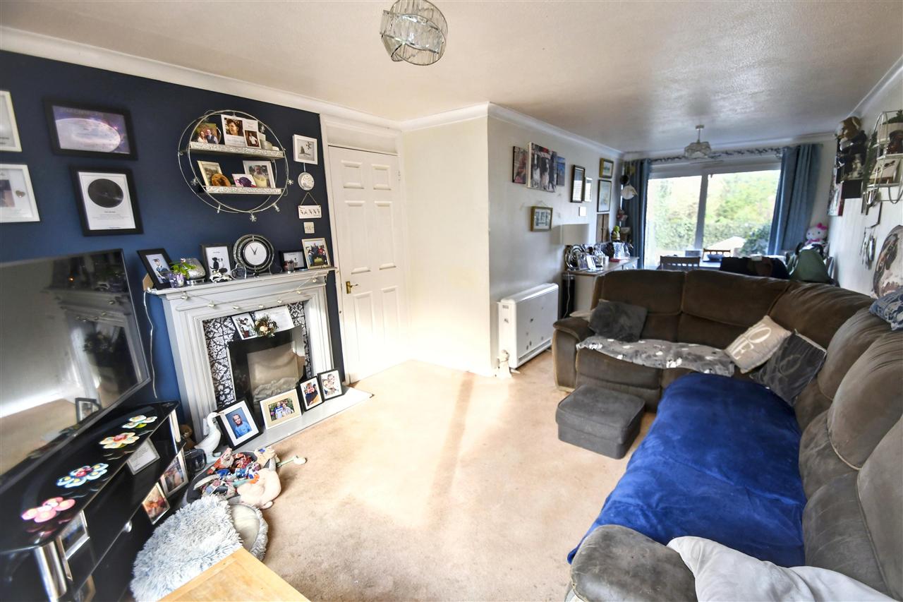 A dual aspect room with a broad UPVC floor-to-ceiling picture window overlooking the front garden and UPVC double glazed patio doors to the rear, feature fireplace with white surround and inset fire, 2 pendant light fittings, serving hatch to kitchen, electric radiator, TV aerial point, fitted carpet.