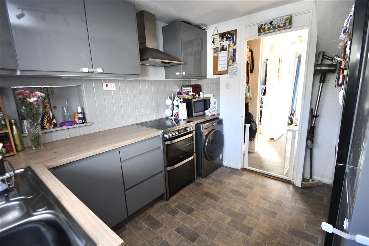 Fitted with a full range of grey gloss wall and base units with wood effect work surfaces and tiled splashbacks, inset 1 1/2 bowl stainless steel sink unit with chrome mixer tap, space for electric cooker with stainless steel extractor fan above, space for washing machine and refrigerator/freezer, stainless steel spotlight fitting to ceiling, vinyl flooring, UPVC double glazed window and UPVC half glazed door to rear porch.