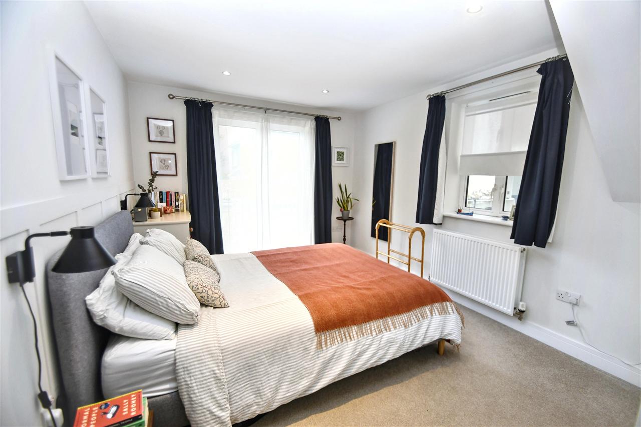 The principal bedroom features a UPVC double glazed window to rear aspect and further UPVC double glazed doors opening onto a Juliette balcony overlooking the side aspect. It includes a half panelled feature wall, neutral fitted carpet, radiator, inset spotlights and a solid wooden door.