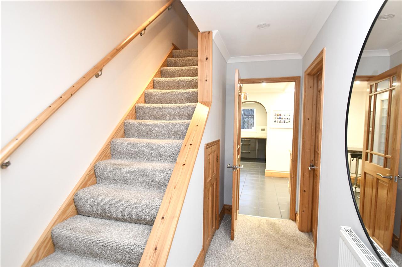 With varnished wood and steel capped handrail to one side and matching safety balustrading glass panels, cove cornicing, double glazed window, linen cupboard, access to insulated loft space with loft ladder.