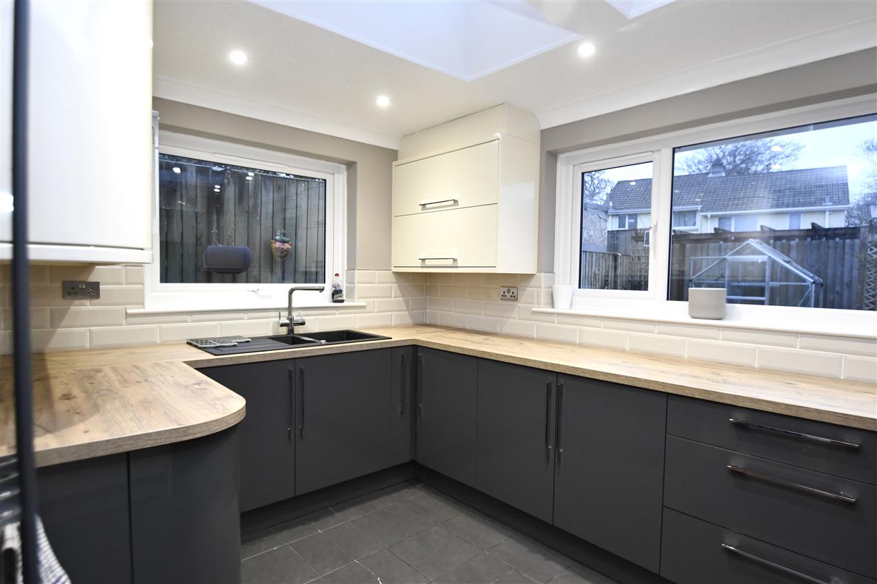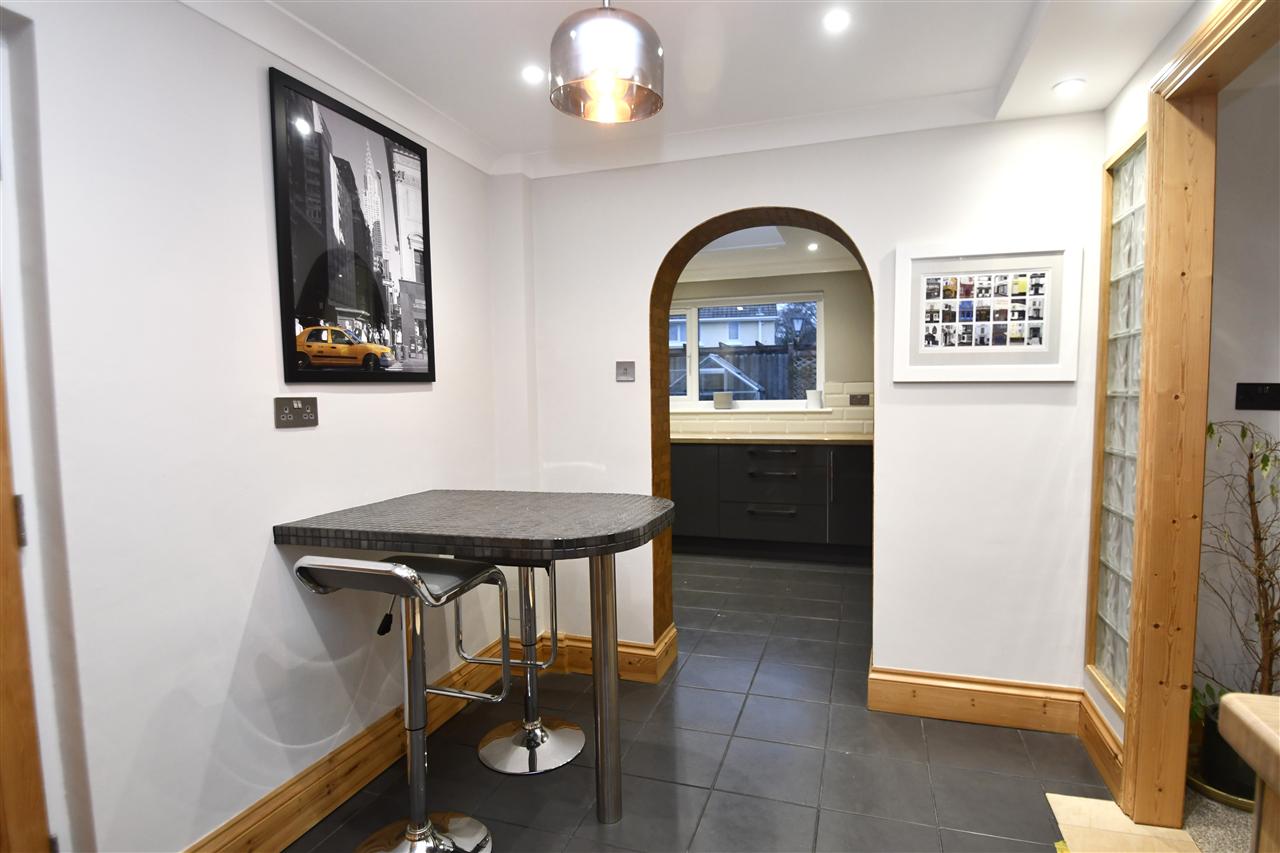 A superb addition to the house enjoying bright dual aspect UPVC double glazed windows to the side and rear elevations. Well equipped with a full range of contrasting matching wall and base units in high gloss ivory and matt grey, two carousel units, brushed steel handles, wrap around wood effect work surfaces and matching tiling over, one and a half bowl composite sink unit with easy on mixer tap, five ring gas hob with stainless steel and glass cooker hood over, coloured glass splash back. Bosch single fan assisted oven, continued ceramic tiled flooring, grey vertical contemporary radiator, triple recessed double glazed sky light windows providing plenty of natural light.