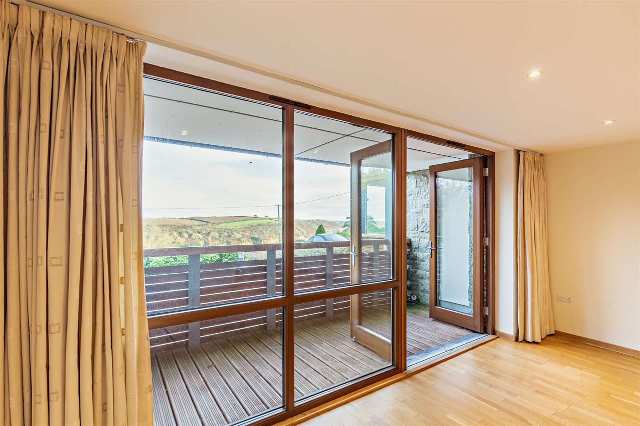 UPVC wood grain effect windows and matching French doors spanning the full width of the room giving access to the terrace and with views towards Maenporth Beach, Falmouth Bay and Pendennis Castle in the distance, inset ceiling spotlights, fire alarm, TV aerial point, multiple power points, inset ceiling spotlights, engineered oak flooring, under floor heating.
