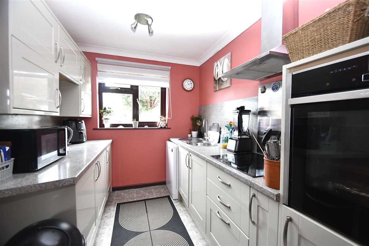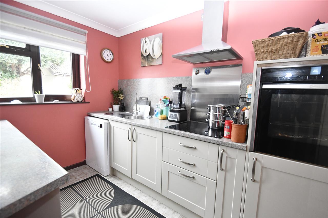 A modern fitted kitchen with a wide range of base and wall units comprising of cupboards and drawers with sage coloured doors and metal door furniture, granite effect roll top work surfaces with matching splashback incorporating a interesting circular stainless steel sink with drainer and mixer tap, four-ring electric hob with stainless steel splash back and matching stainless steel extractor canopy over, built-in tilt and slide stainless steel electric oven, integrated refrigerator/freezer, recess and plumbing for dishwasher, plastered coved ceiling with spotlights, UPVC double glazed window to the front and a frosted window to the side.