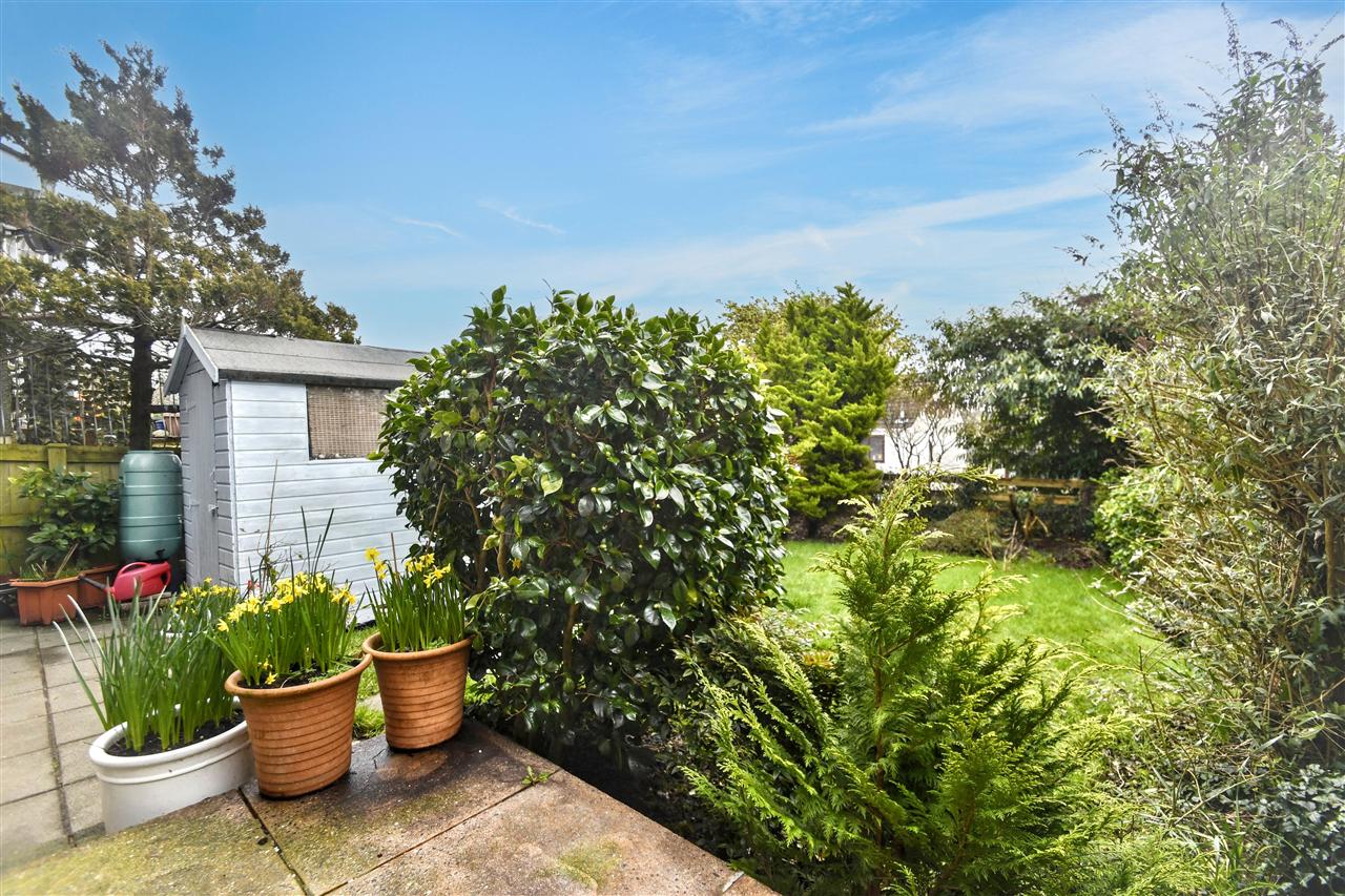 A pleasant enclosed garden with a wide variety of mature plants with shrub borders, a lawn and a range of patio areas with a gate to the side access.