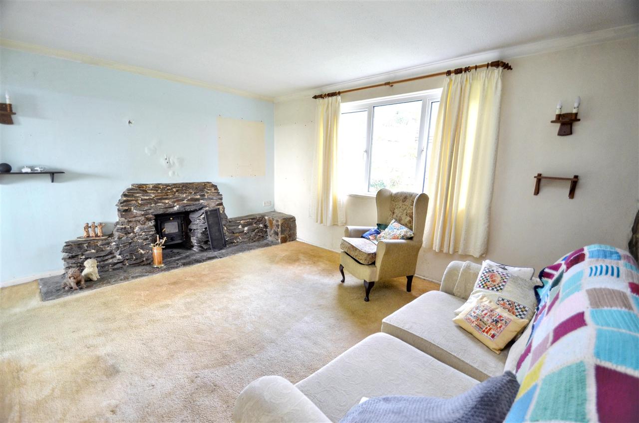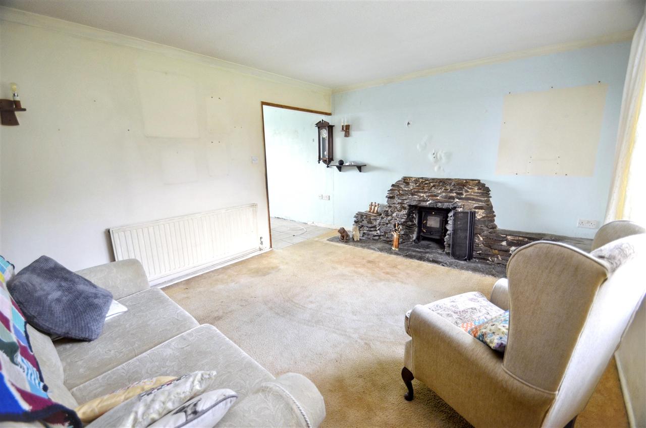 A feature local stone fireplace housing a woodburner (not tested) with stone hearth, UPVC double glazed window with a pleasant outlook over the front garden, part stone wall, radiator and finish with a carpet.