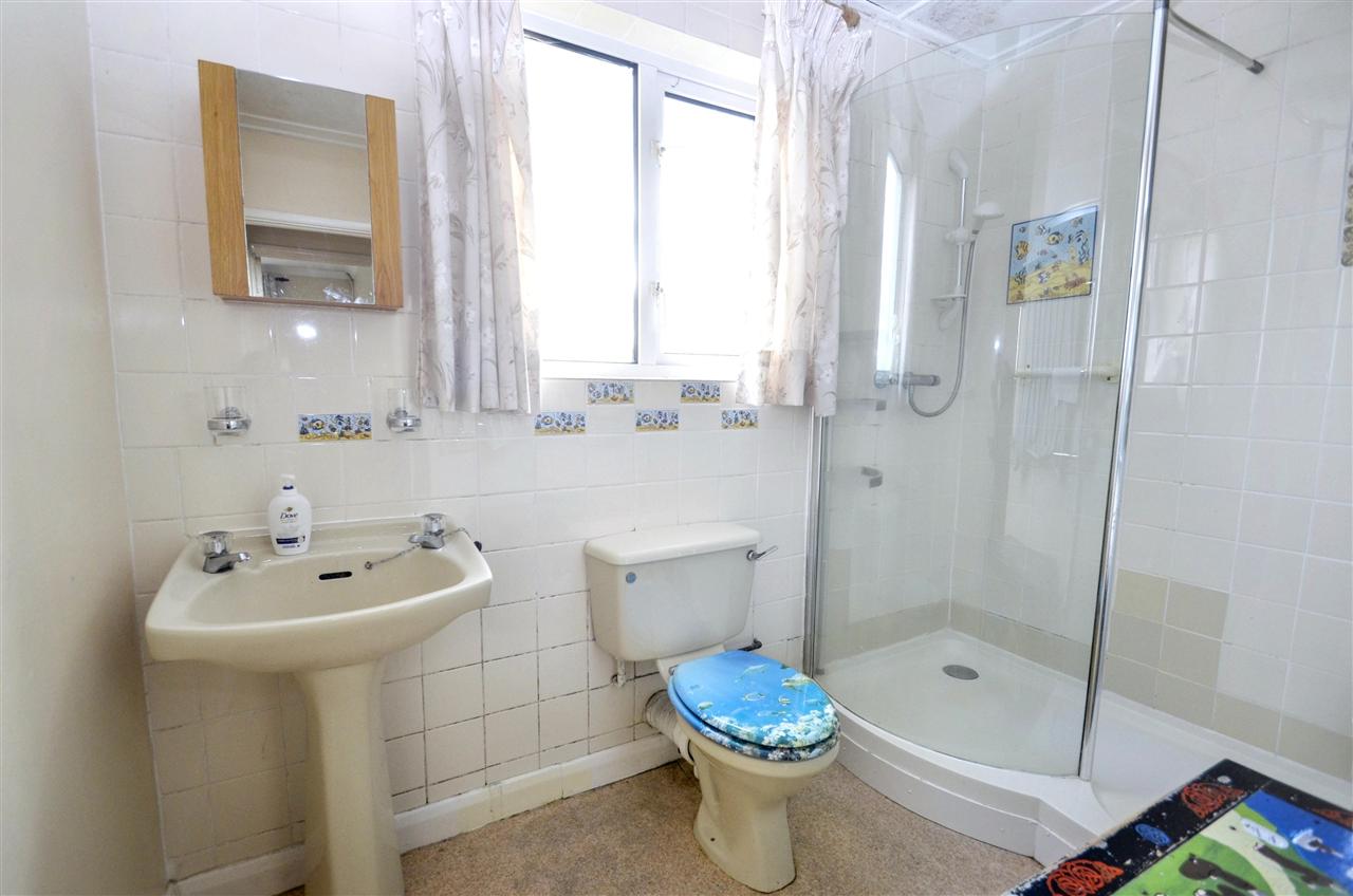 A three piece suite comprising; shower cubicle with glass screen, low-level wc and pedestal wash hand basin, part tiled walls, heated towel rail, vinyl flooring, UPVC double glazed window with spectacular uninterrupted rural views.