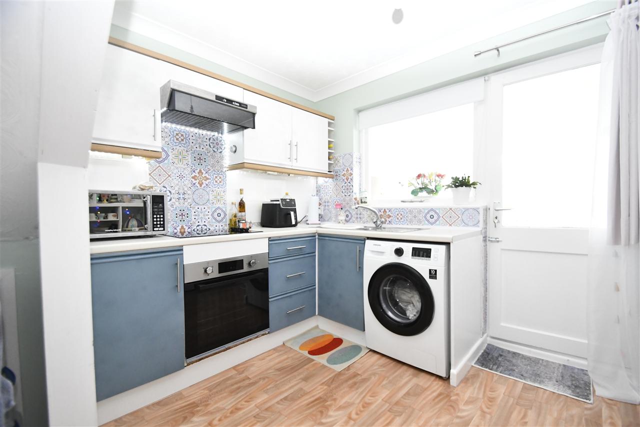 A fitted kitchen with a good range of wall and base units, consisting of cupboards and drawers with metal door furniture, a roll top work surface with tiled splashback, a one and a half bowl sink with drainer and mixer tap. Built in four ring electric hob with stainless steel extractor fan over and matching stainless steel oven, recess and plumbing for a washing machine, textured coved ceiling with ceiling light, radiator, door to useful under stair storage area, window overlooking the rear finished with a vinyl floor. A glazed door opening to the sunroom/conservatory.