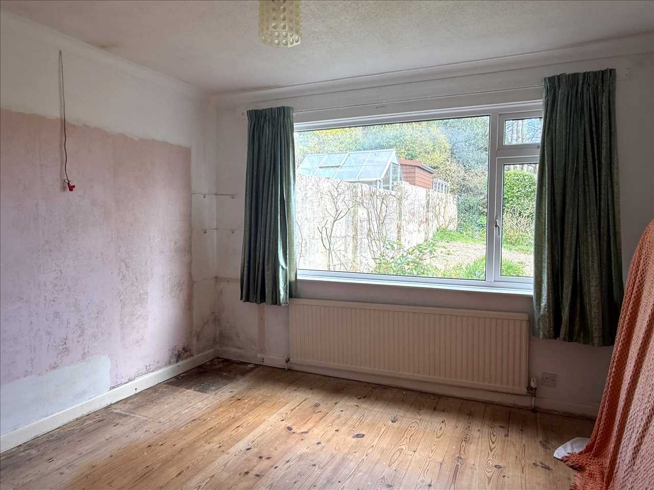 Broad UPVC double glazed window with lovely views across the daffodil green to light woodland and Tregonniggie, radiator, central ceiling light.
