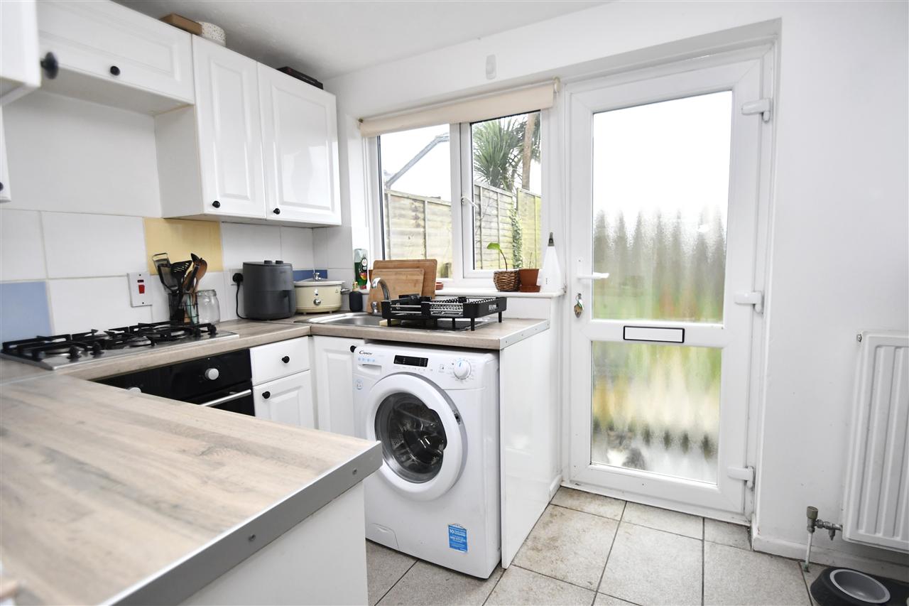 Equipped with a range of matching wall and base units in high gloss white, wrap around wood effect work surfaces and ceramic tiling over, 1 1/2 bowl single drainer stainless steel sink unit, four-ring stainless steel gas hob and single fan assisted oven under, double radiator, ceramic tiled flooring, Vaillant gas central heating boiler, deep under stairs storage cupboard, plumbing for washing machine, space for tallboy refrigerator/freezer, double glazed window and door to outside.