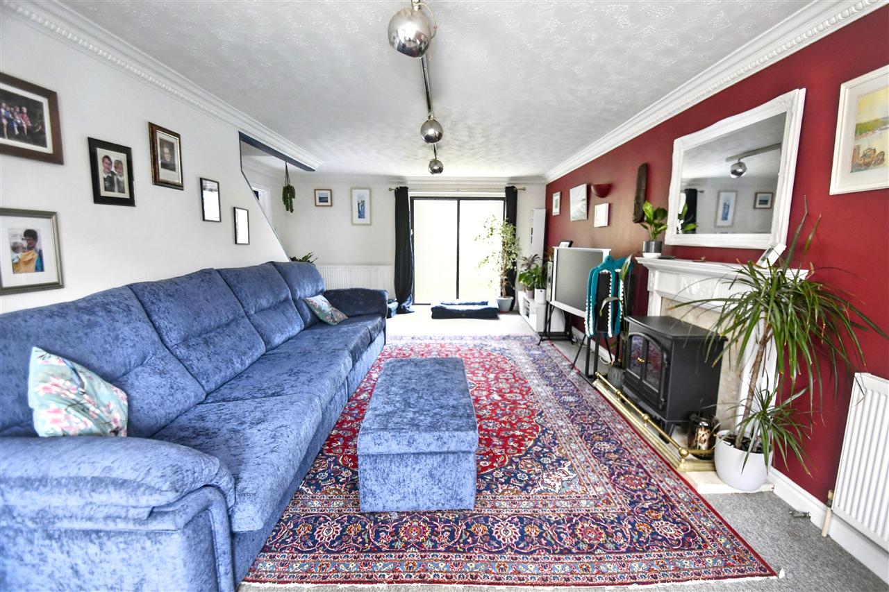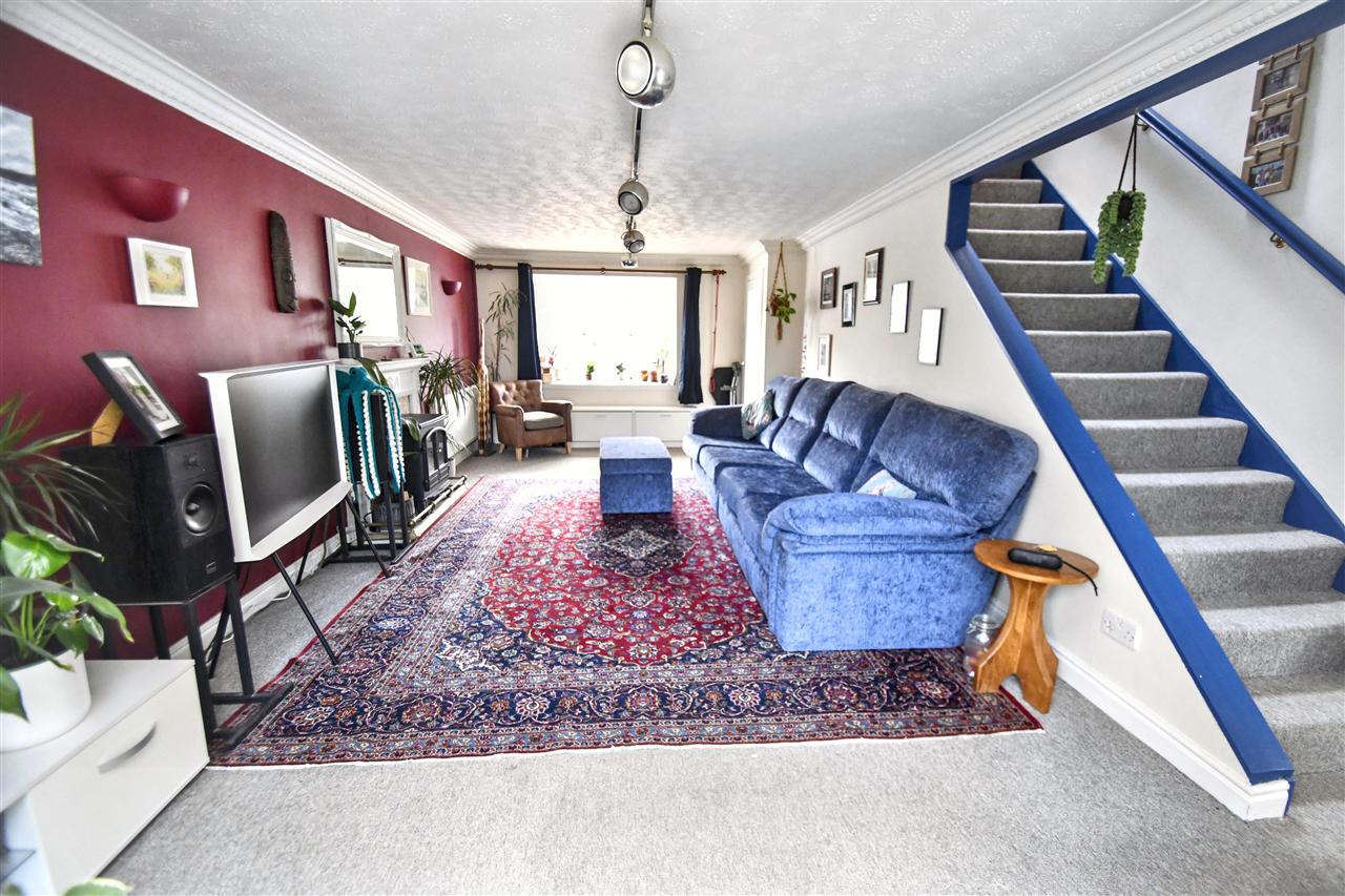 A generously proportioned dual aspect lounge filled with natural light having UPVC lattice style window overlooking the front elevation and UPVC double glazed patio doors with Juliette balcony overlooking the enclosed rear garden, an Adam style fireplace with electric stove set on a marble hearth, large radiator, two wall uplighters, carpet, chrome light fitting, ornate coving, staircase leading to first floor landing and bedrooms.