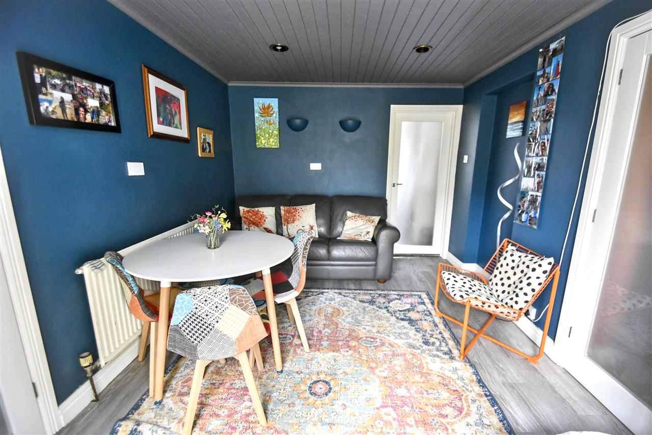 Access via an opaque fully glazed door from the lounge, UPVC double glazed patio doors to balcony overlooking the rear garden, painted panelled ceiling with inset ceiling spotlights, laminate flooring, two wall mounted uplighters, opaque fully glazed doors giving access to the second reception room and kitchen.