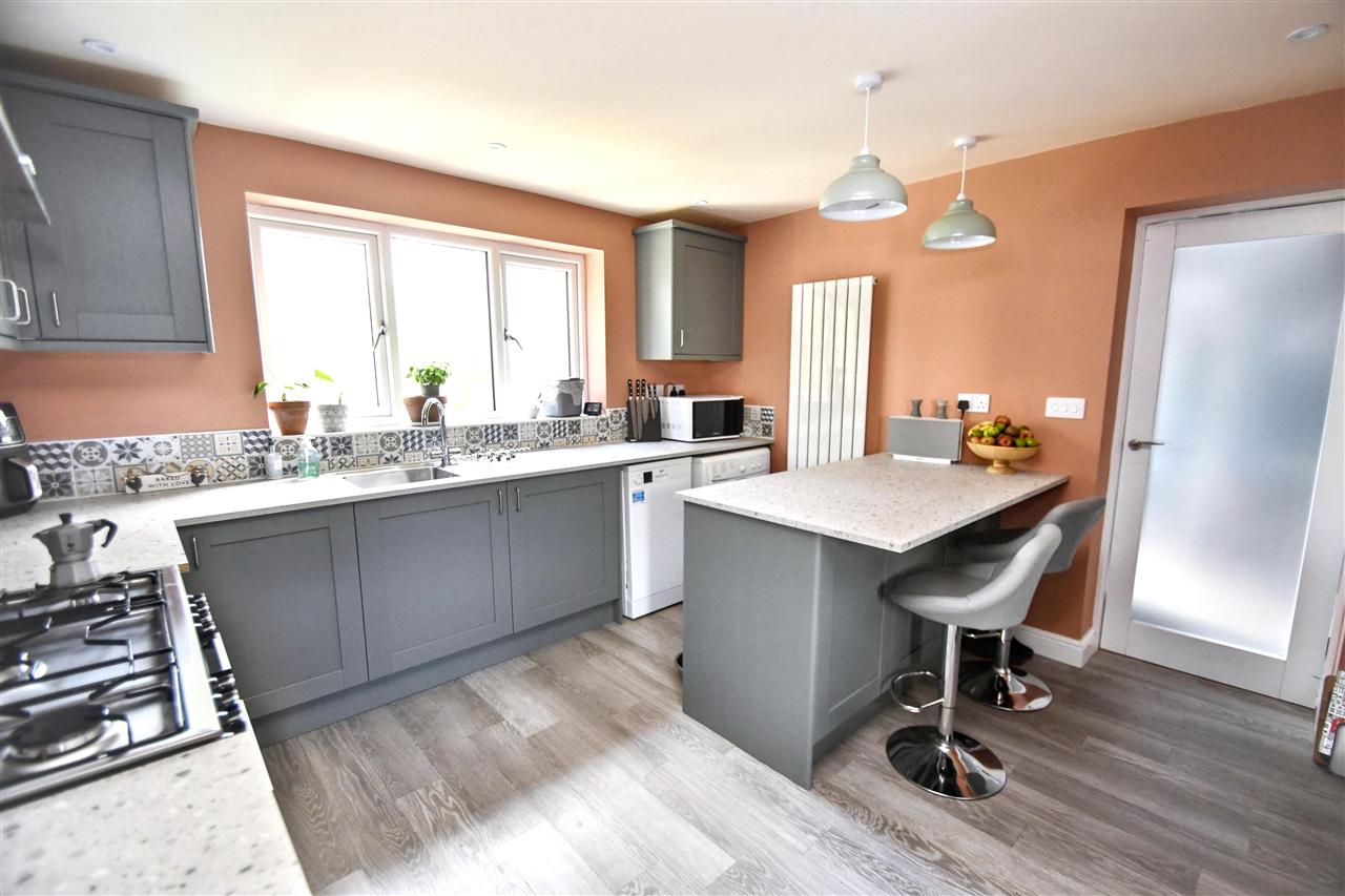 UPVC double glazed door from the front, opaque fully glazed door from the dining room and door leading to the integral garage, UPVC double glazed window overlooking the rear. Equipped with a range of newly fitted matching wall and base units in grey and chrome handles and marble work surfaces over, ceramic tiled splashback, inset stainless steel sink with chrome mixer tap, laminate flooring, vertical radiator, space for dishwasher, washing machine, refrigerator/freezer, Beko range style cooker with five-ring gas hob and stainless steel extractor over, breakfast bar with two pendant lights over, inset ceiling spotlights, laminate flooring.