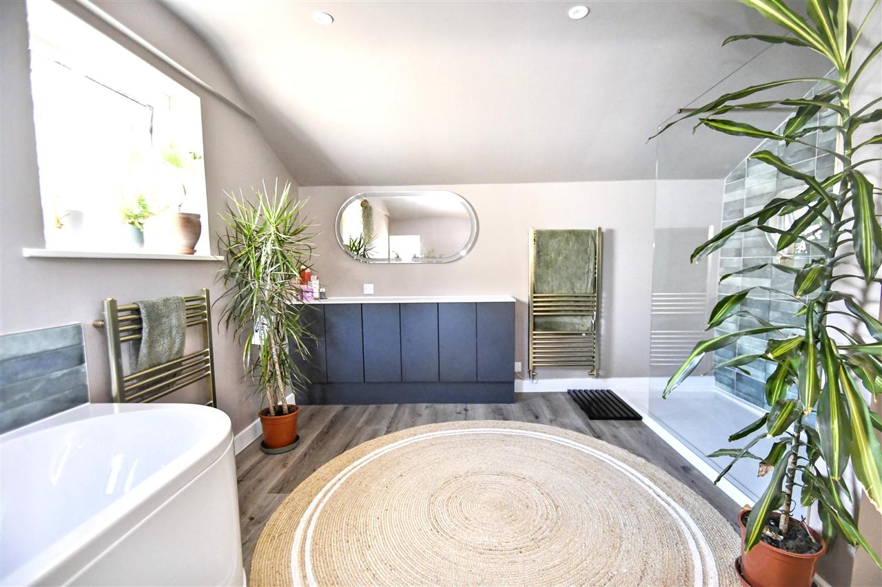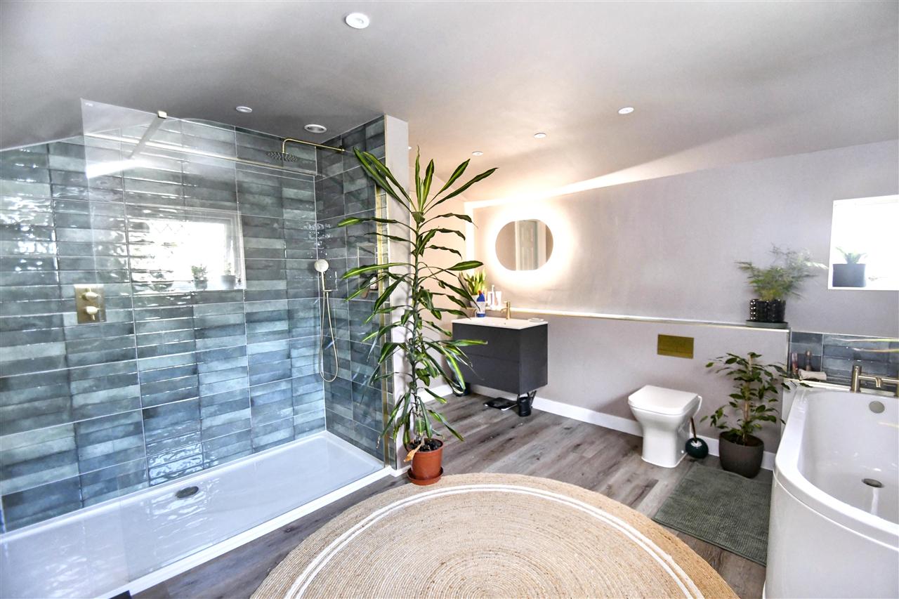 Luxuriously appointed with a four piece white suite comprising; panelled, curved bath with mixer taps, concealed cistern low-level flush wc, wall mounted vanity unit with inset wash hand basin and mixer taps, double walk-in shower with tiling and gold effect taps and sensor lights, laminated flooring, two gold effect towel rails, dual aspect UPVC double glazed windows, inset ceiling spotlights, laminate flooring.