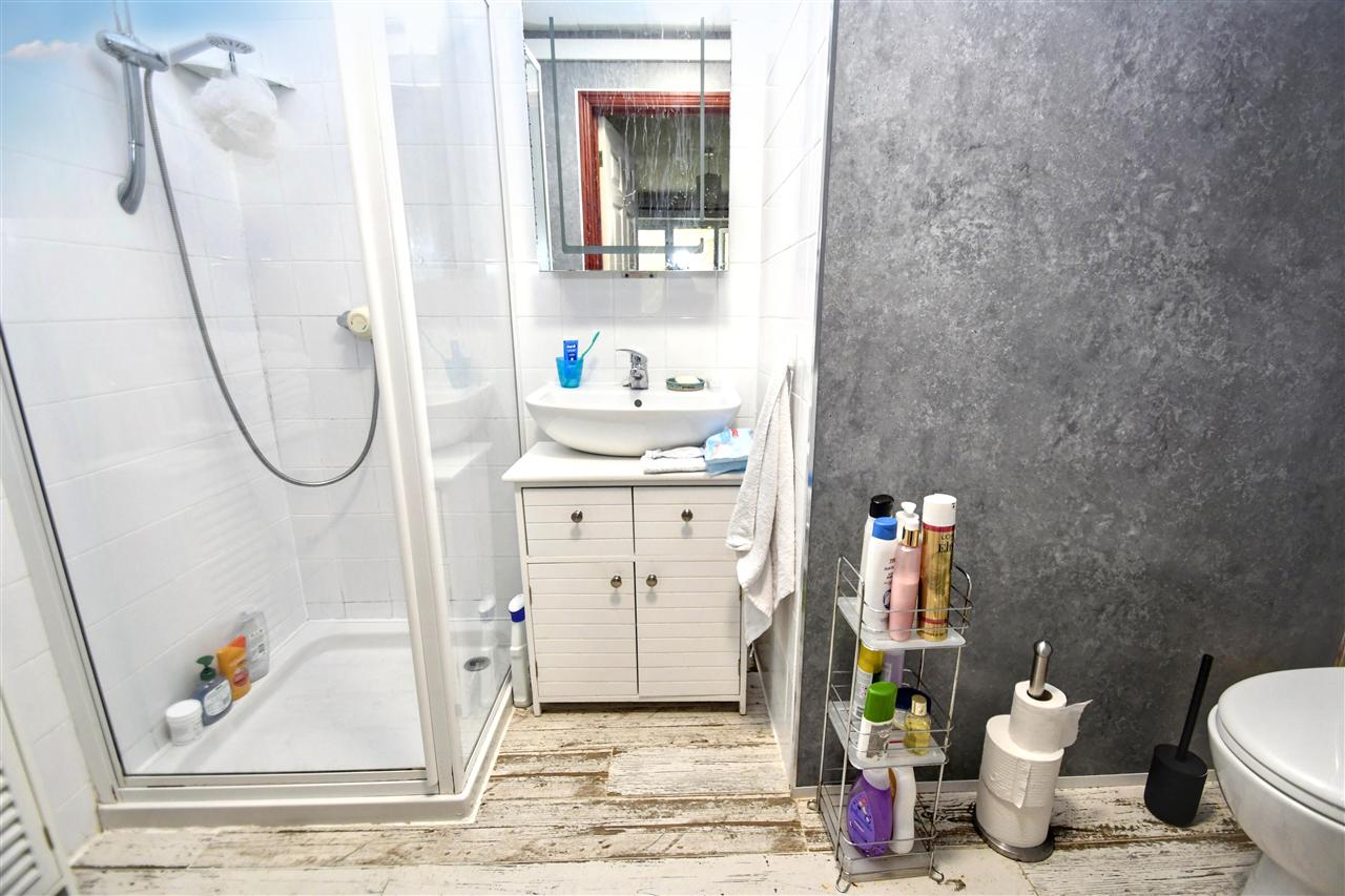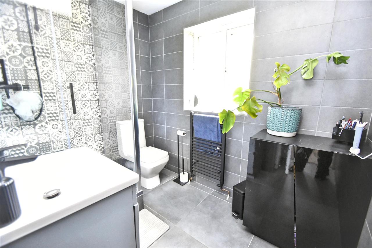 Frosted UPVC double glazed window to the rear. Fitted with a white suite comprising; walk-in shower cubicle with glass door, vanity unit with inset wash hand basin, low-level flush wc, black heated towel rail, fully tiled walls and floor.