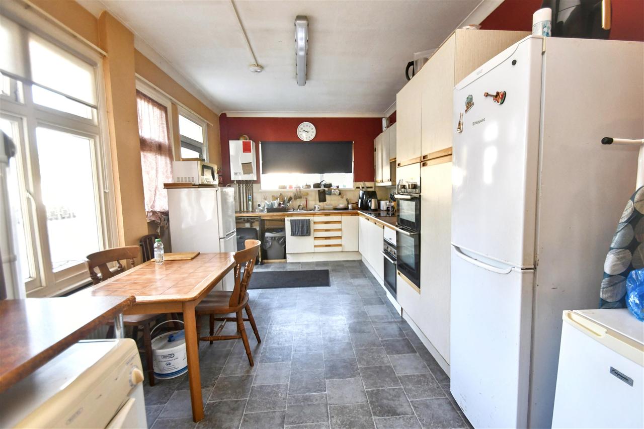 This large kitchen/breakfast room is equipped with a range of matching wall and base units, toll top work surfaces and tiling over, single drainer stainless steel sink unit, electric ceramic hob, space for tallboy refrigerator/freezer, double oven set within housing, dual aspect with windows overlooking the side and rear, vinyl flooring, strip light, door to outside.