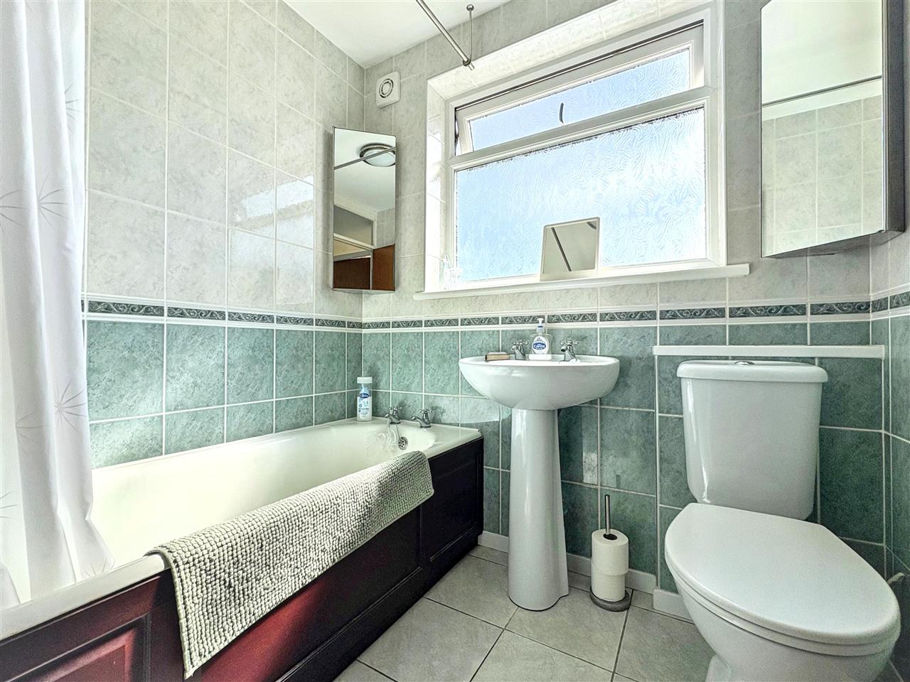 UPVC frosted double glazed window with hard tile flooring, fully tiled surround white suite comprising of a bath with Triton electric shower over, white sink with hot and cold taps, low level wc and a dimplex extractor fan, vanity mirror and a wood door.