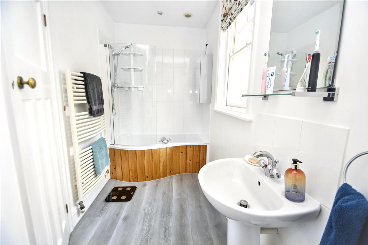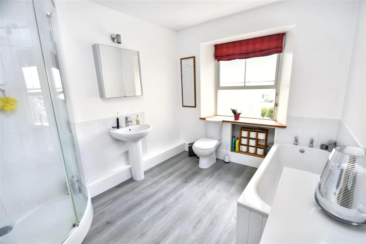 A three piece suite comprising; P-shaped bath with shower screen and tiled splash back, low-level wc with push button flush, pedestal wash hand basin, heated towel rail plastered ceiling with downlights and extractor fan, two sash windows views to St Gluvias Church, finished with a vinyl floor.