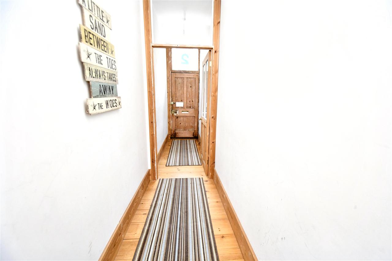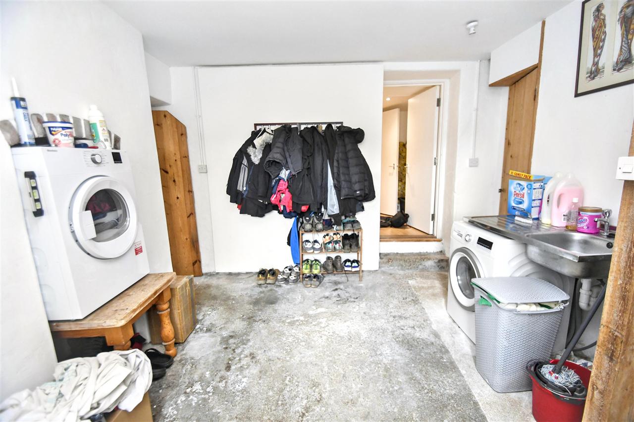 A spacious hallway/utility room with the added benefit of being a utility room and an area for coats and boots, stainless steel sink with drainer, recess and plumbing for washing machine, recess for dryer, wall mounted Vaillant gas combi boiler, plastered ceiling, ceiling light, doors to the lower ground floor wc, kitchen and ground floor bedroom/storage room and shower room, staircase to first floor.